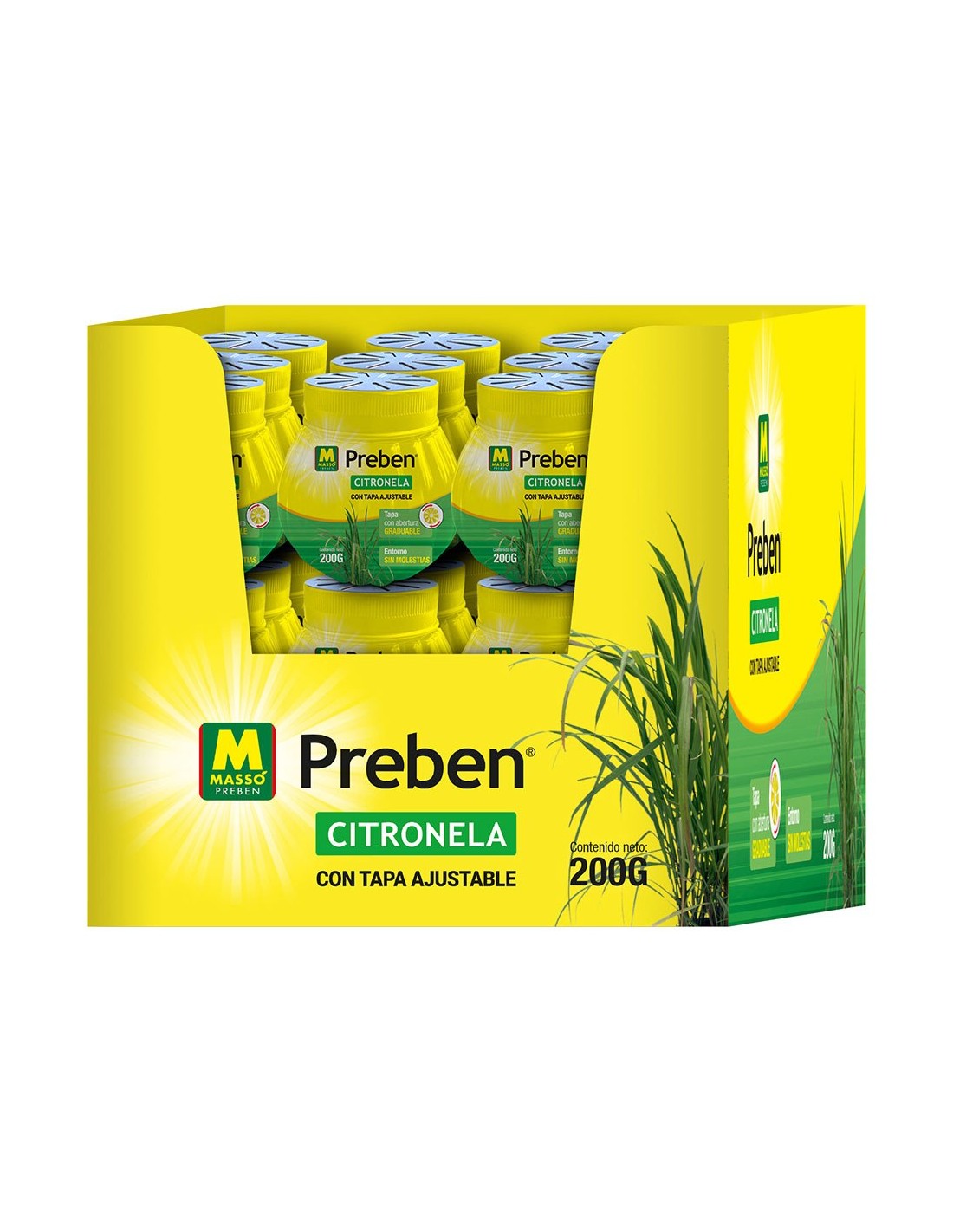 Gel con citronela tapa graduable preben 200 g. impregna el ambiente con una fragancia fresca y agradable a limón. para uso en exterior e interior. duración aproximada: 4 a 6 semanas. intensidad de aroma regulable. presentado en expositor de 12 uds