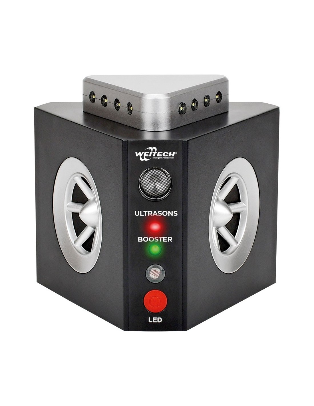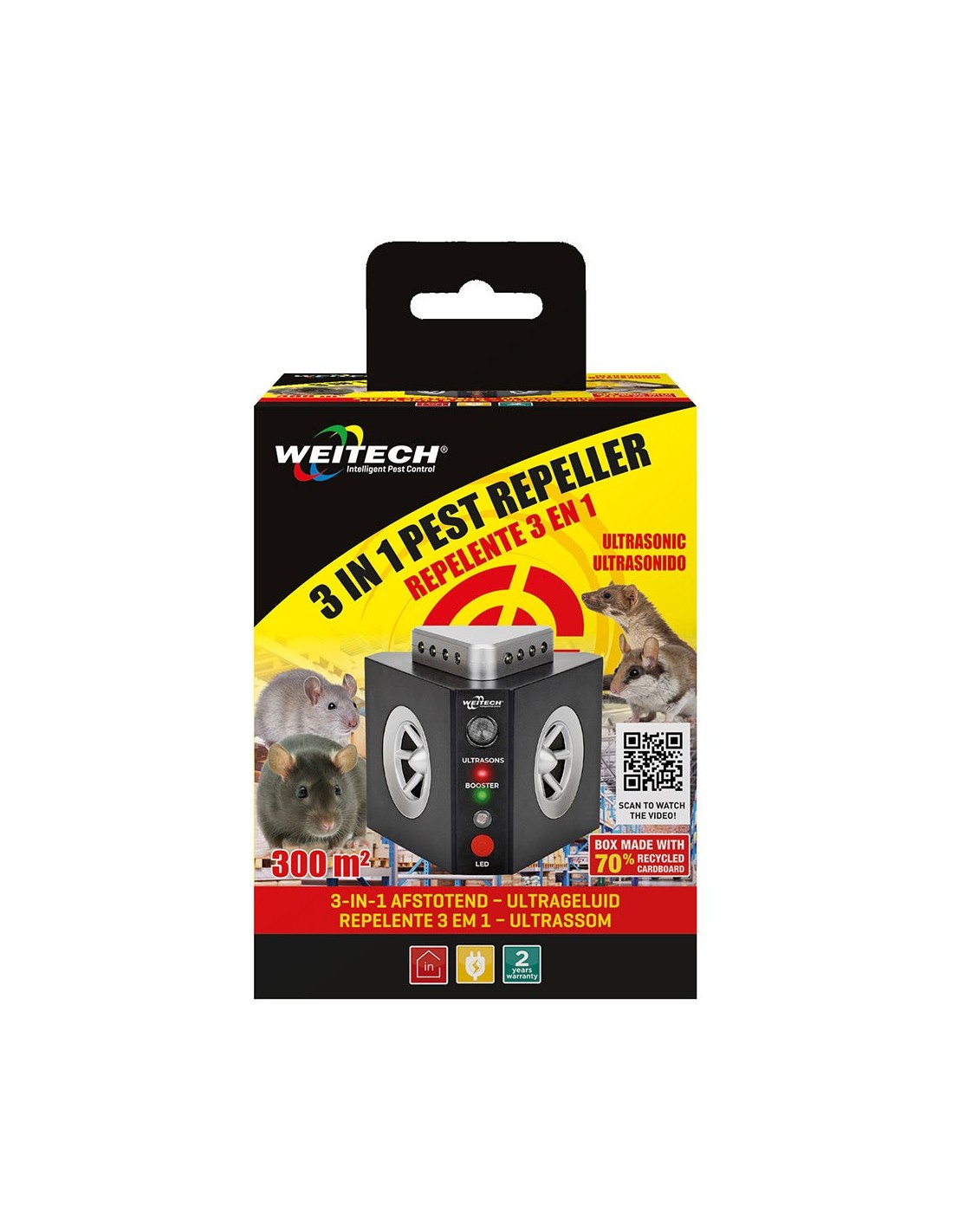 Repelente ultrasónico 3 en 1 para roedores. cobertura hasta 300 m² en interiores. incluye 2 altavoces de 240°, amplificador de frecuencia y sistema flash 360° con 12 leds y sensor de luminosidad. tensión: 220 - 240 v ~50/60 hz. dimensiones: 11 x 9,5 x 9,5 cm