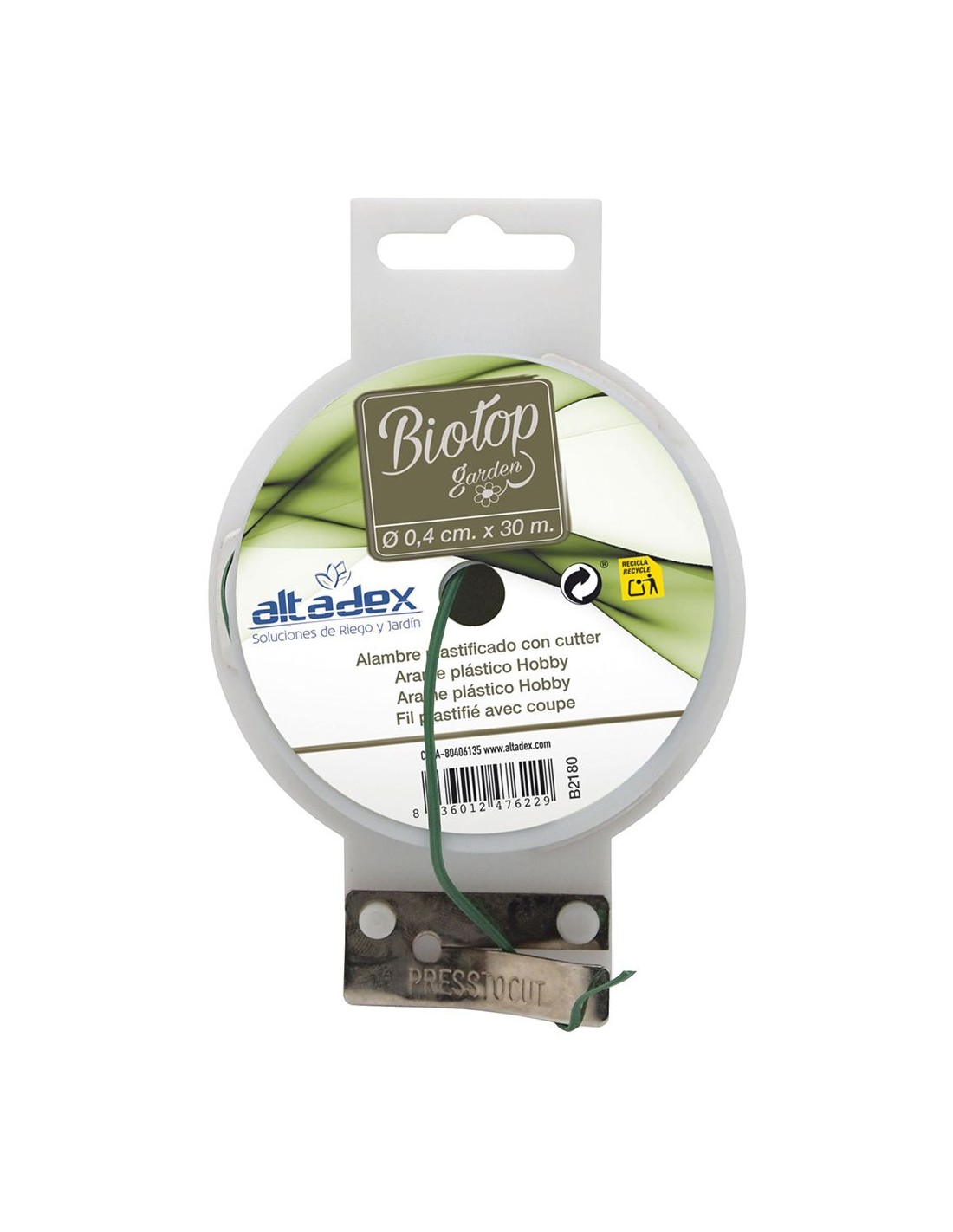 Alambre plastificado verde, incluye cortador incorporado en el carrete flexible y resistente para sujeción y entutorado de plantas, ø2 mm x 30 m