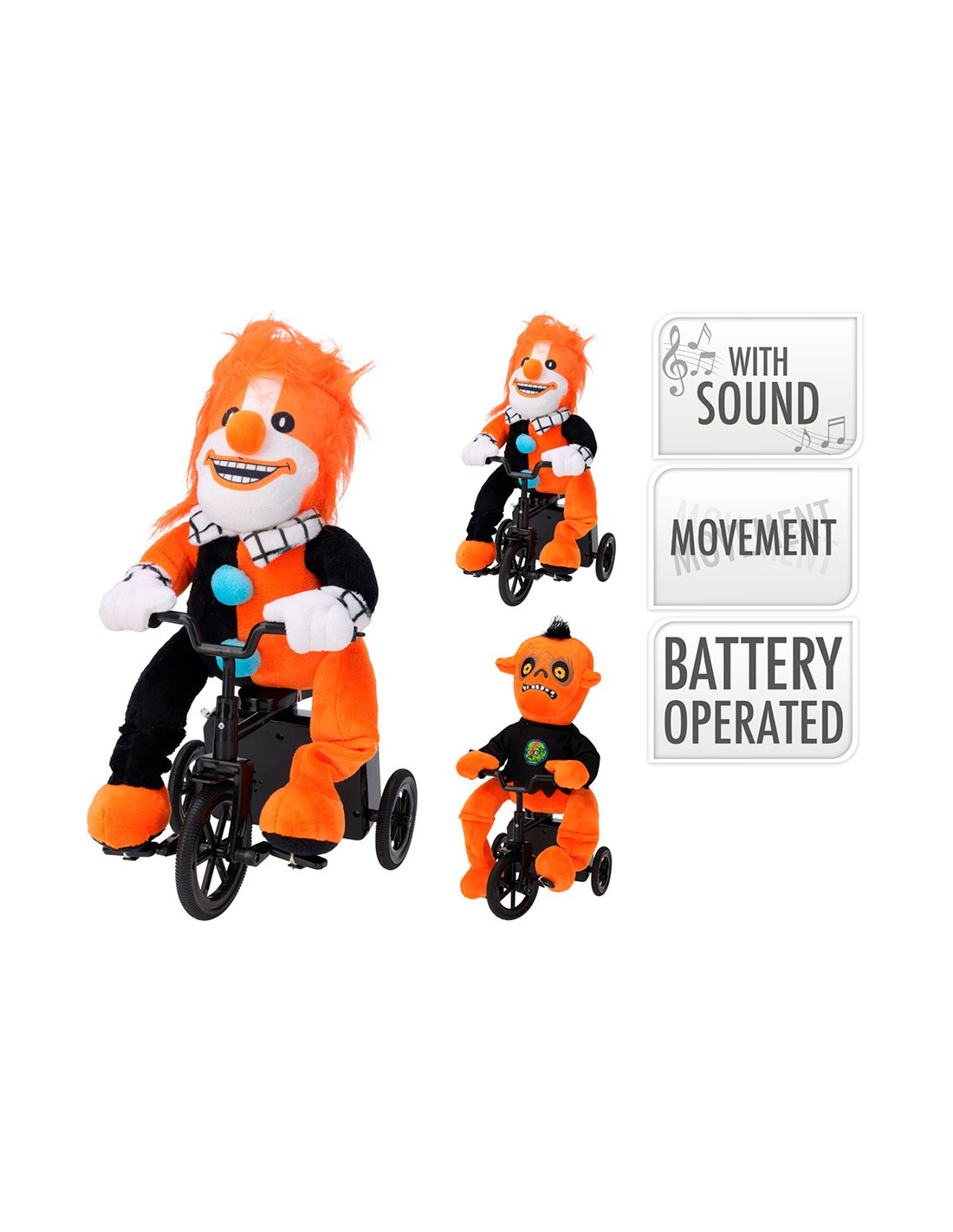 Figura de halloween en bicicleta con sonido, movimiento y luz. bateria 3 pilas x aa (no incluidas). modelos variados. dimensiones 19 x 15 x 33 cm