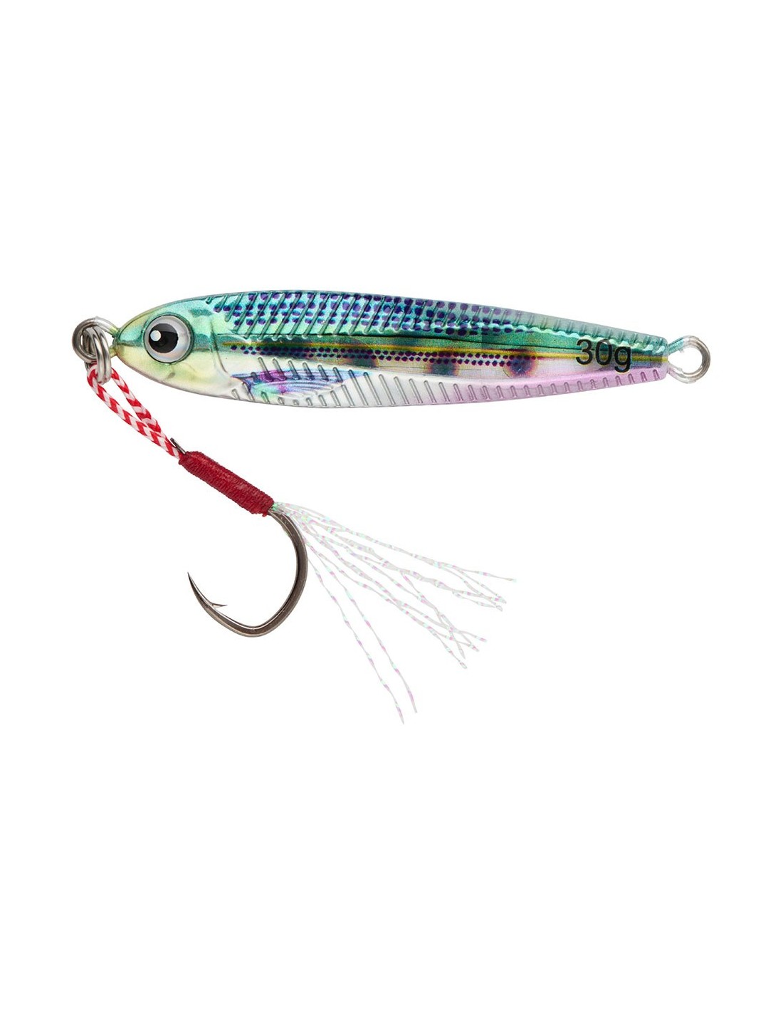 Jig metálico con un peso de 20 g, cuerpo alargado y estilizado que permite lances largos y precisos, además de una caída rápida y natural que imita a un pez en apuros, incorpora una cucharilla junto al anzuelo que genera brillos y vibración adicionales, combina un movimiento errático y brillante en recogida y efecto parpadeante en caída, provoca ataques tanto en vertical como a jig casting, color 01
