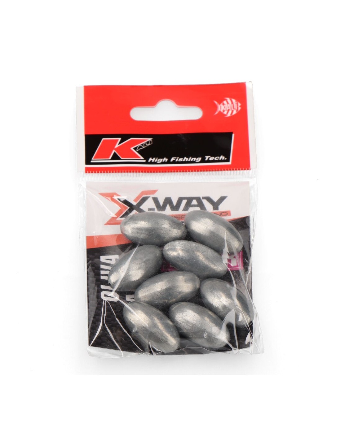 Pesos de pesca ecológicos fabricados en zamak, aleación no contaminante, resistentes, duraderos y que ofrecen un comportamiento similar al plomo convencional, forma de oliva, bolsa 11 uds de 5 g cada una