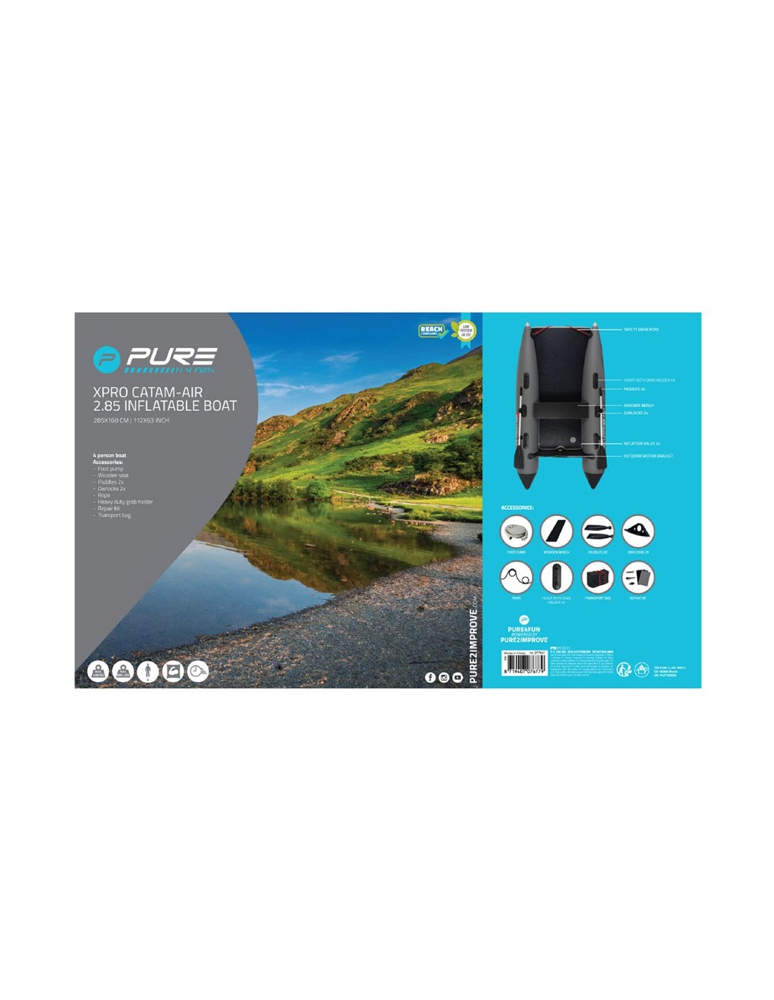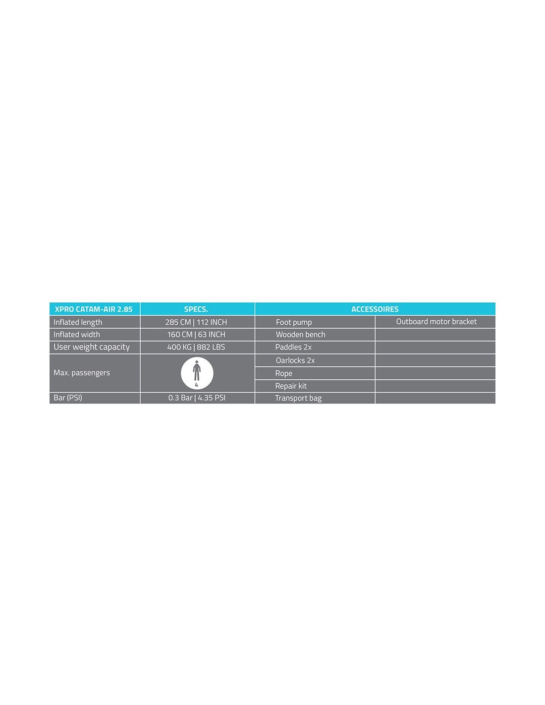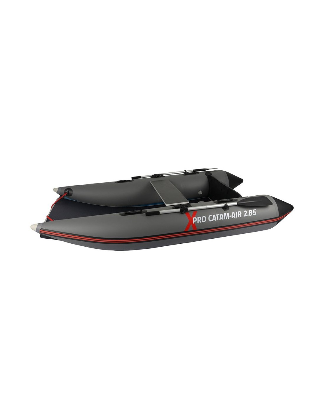 Bote catamarán, modelo xpro catam-air 2.85, hinchable, máxima potencia del motor 6 cv / 4,4 kw. carga máxima 400 kg, para 4 pasajeros. 5 cámaras de aire. iso 6185-1 tipo 2. contiene: bomba de pie, banco de madera, soporte de motor fuera de borda, 2 remos, 2 soportes de remo, cuerda de agarre de seguridad, kit de reparación y bolsa de transporte. motor fueraborda no incluido. peso: 30 kg dimensiones: 285 x 160 cm