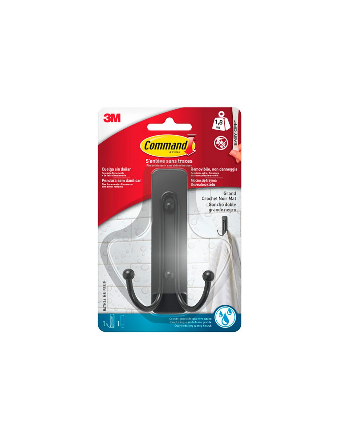 Gancho doble, grande, negro mate, 1 ud + 2 tiras, bath36, carga máxima 1,8 kg