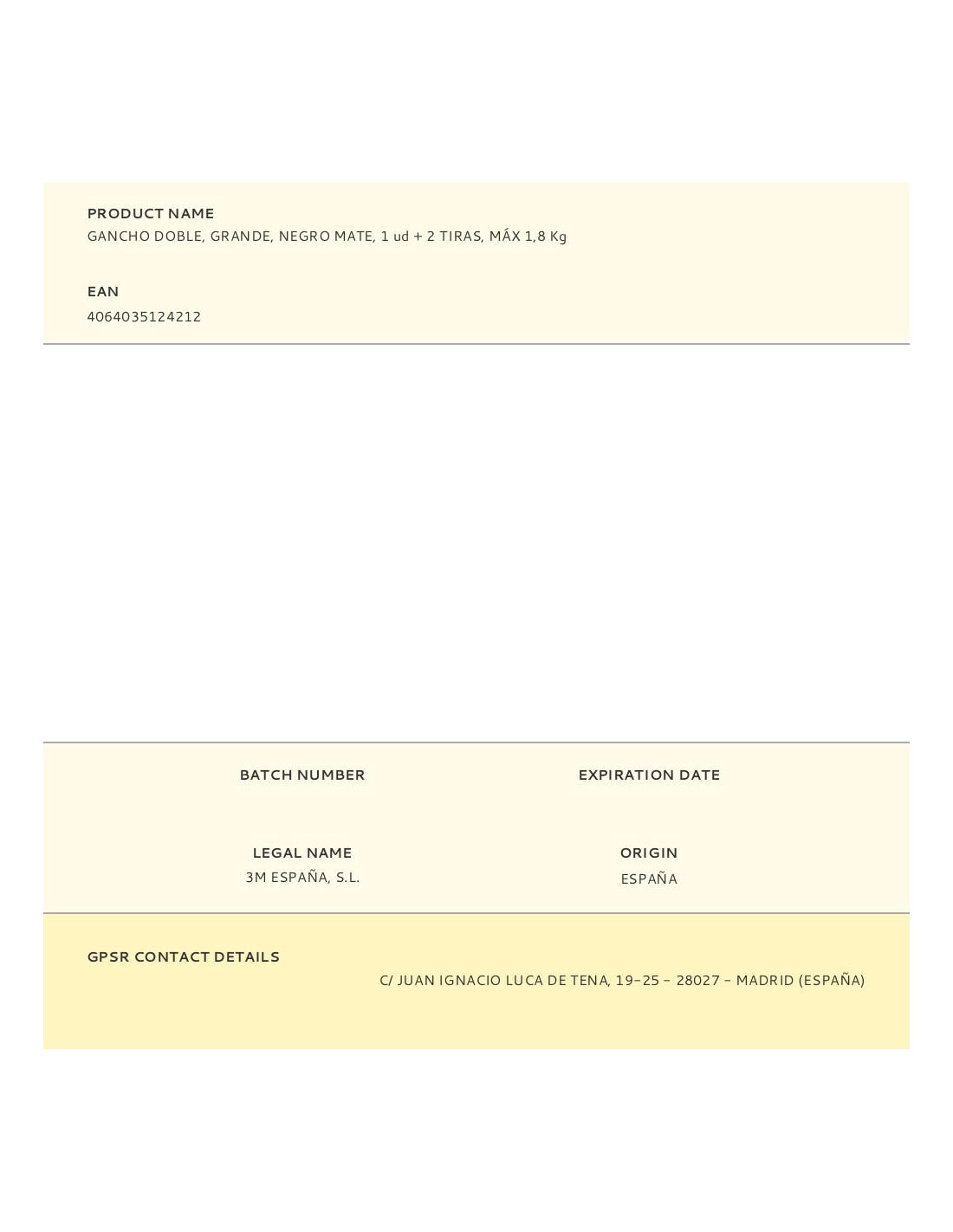 Gancho doble, grande, negro mate, 1 ud + 2 tiras, máx 1,8 kg