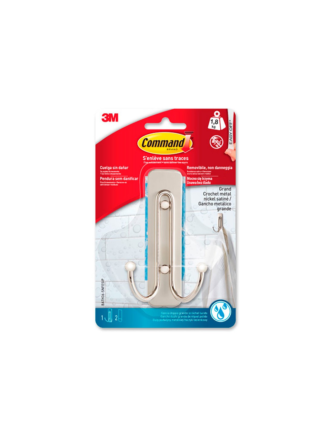 Gancho doble, grande, níquel satinado, 1 ud + 2 tiras,carga max 1,8 kg
