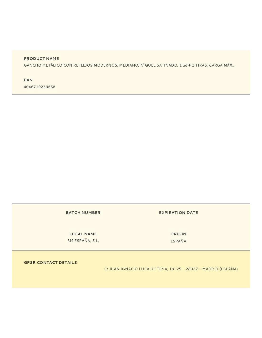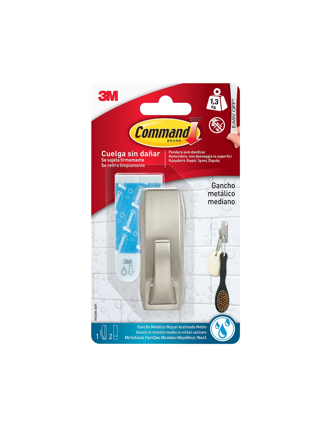 Gancho metálico con reflejos modernos, mediano, níquel satinado, 1 ud + 2 tiras, carga máx 1,3 kg