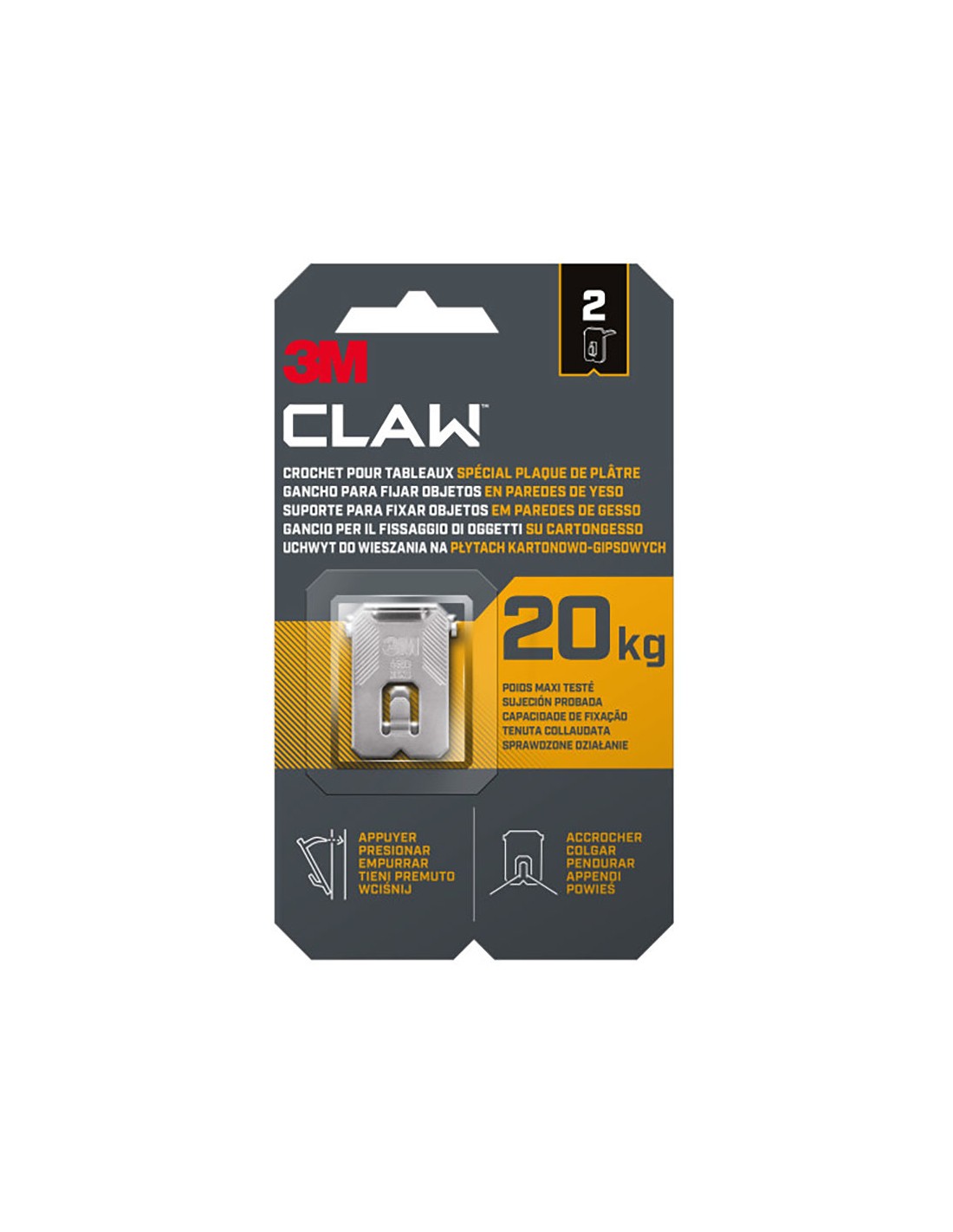Gancho para paredes de yeso, 20 kg, 28 x 41 x 4 mm, 2 uds