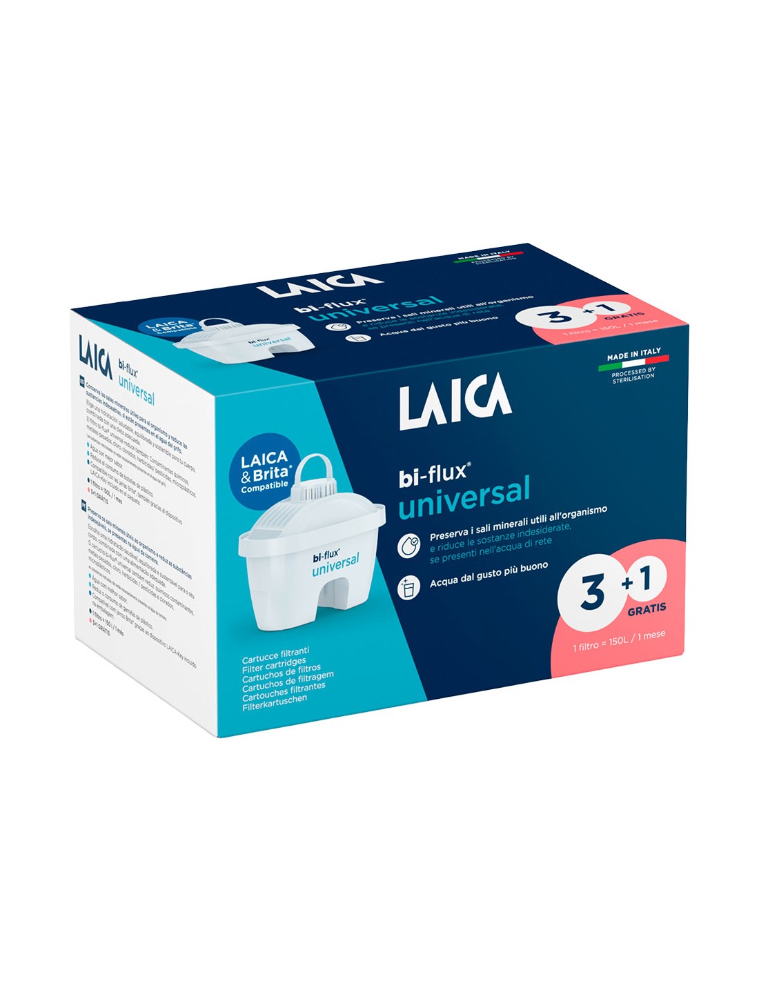 Caja con 4 filtros bi-flux. duración de 150 litros / 1 mes por filtro. el filtro bi-flux conserva las sales minerales útiles para el organismo y reduce el cloro, la cal, metales pesados, contaminantes químicos y algunos pesticidas y herbicidas. estos filtros son compatibles con todas las jarras de brita gracias al dispositivo laica-key incluido