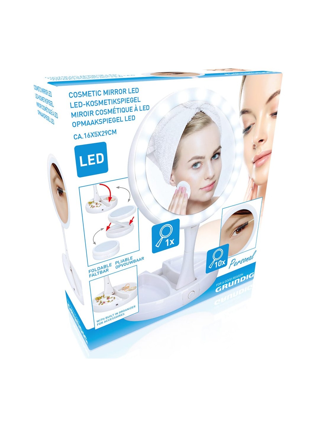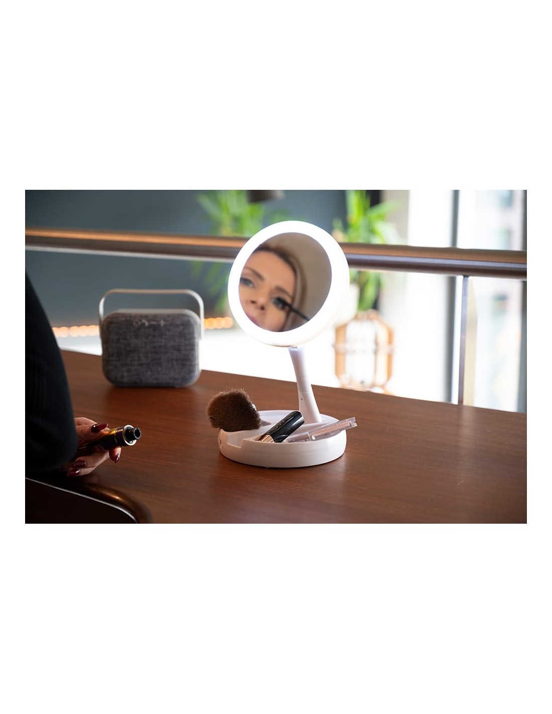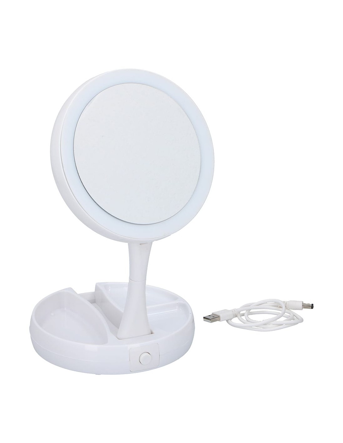 Espejo led con aumento plegable, ángulo ajustable, base antidelizante, 3 compartimentos para almacenar pequeños objetos, 21 leds, funciona con pilas 4 x aa o conectado a la luz con cable micro-usb (incluido), color blanco 16 x 16 x 29 cm