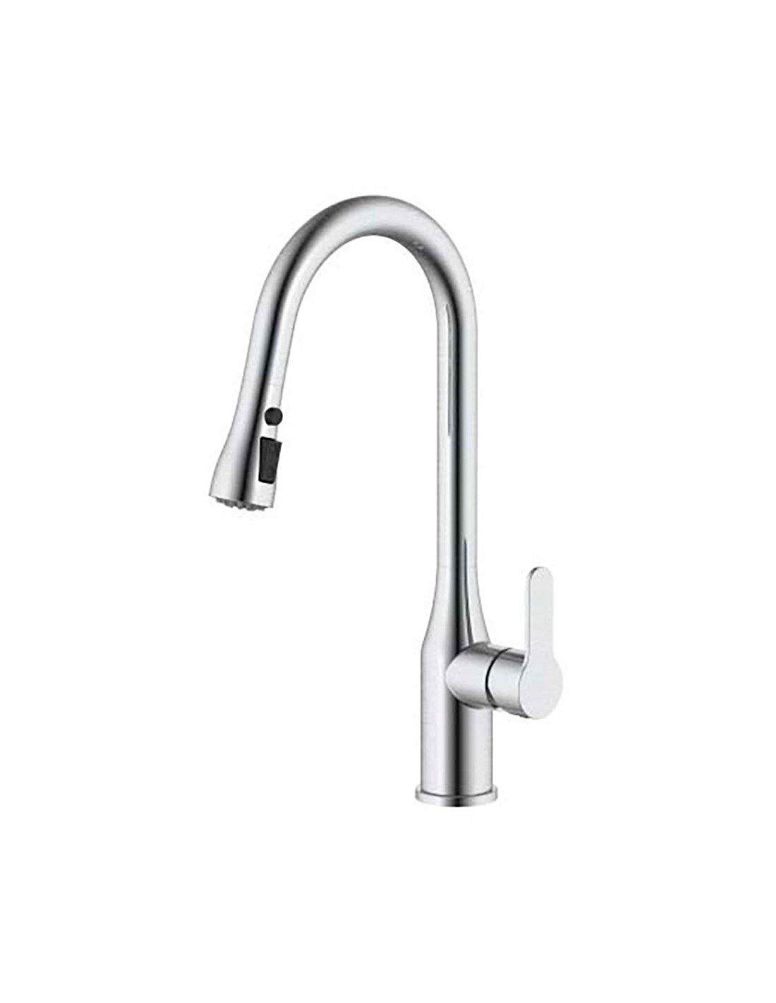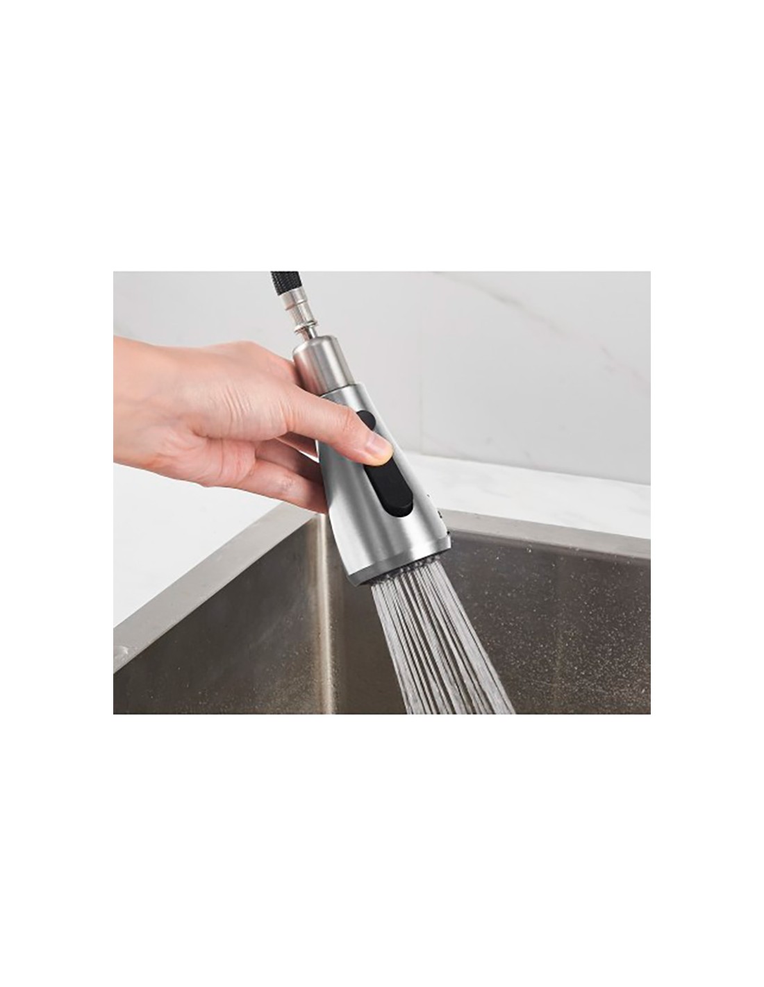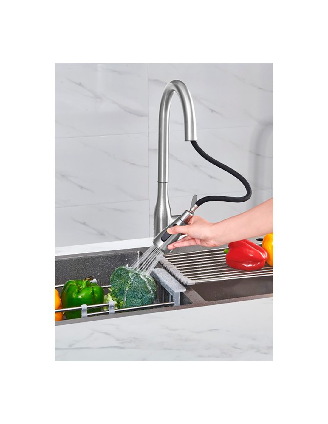 Grifo de cocina monomando con caño alto, serie trazo, plateado cepillado mezclador repisa: cuerpo de acero inoxidable 304, cartucho ø35, ducha extraíble con pulsador, caño giratorio incluye: enlaces de alimentación flexibles m10 3/8" x 350 mm sistema de instalación fácil y rápido. dimensiones: ø55 x 195 x 449 mm