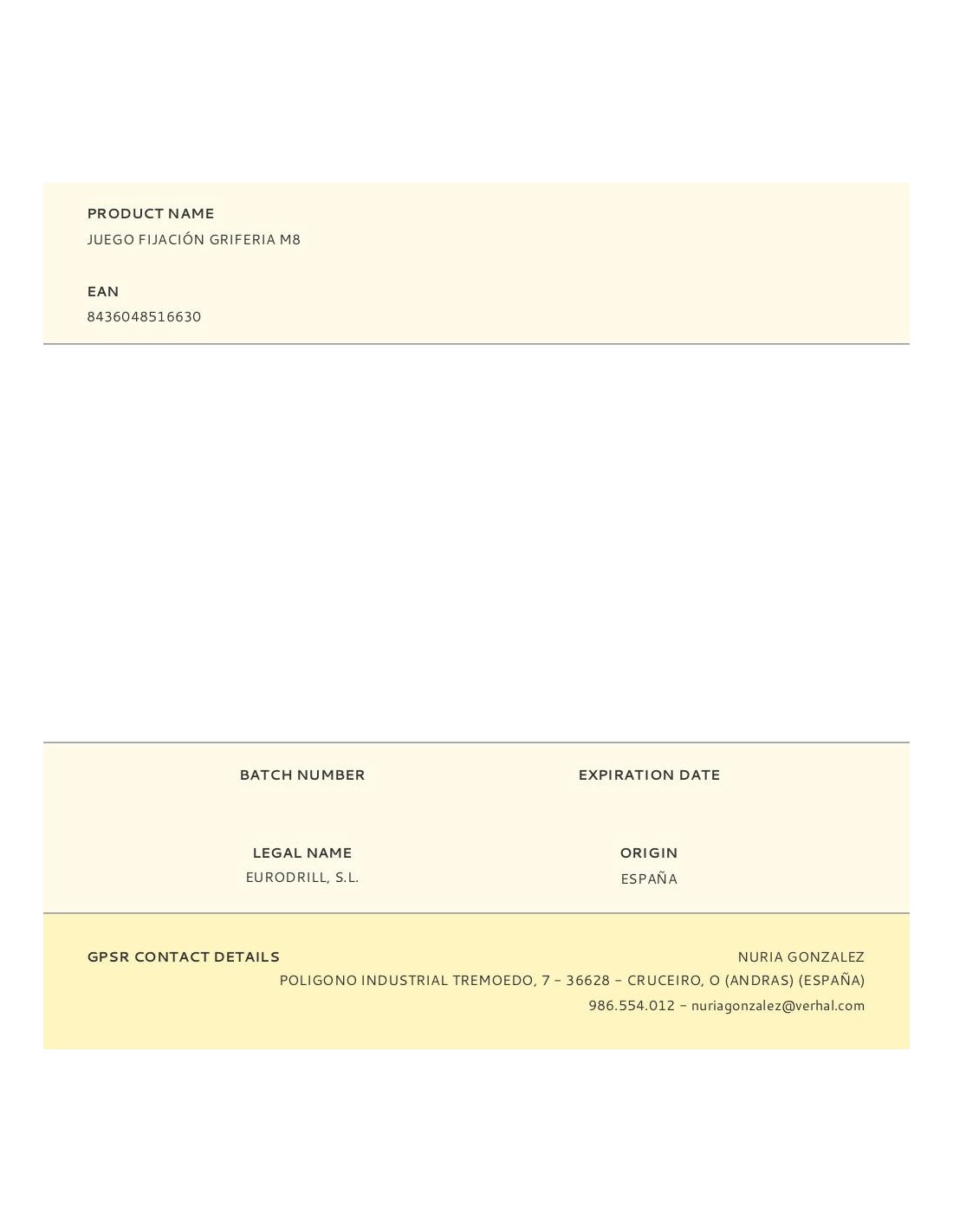Juego fijación griferia m8 compuesto por 1 ud junta tórica ø40 mm, 1 ud junta goma 48 mm 1 ud base 48 x 2,5 mm 1 ud varilla ranurada m8 x 70 mm 1 ud tuerca larga m8