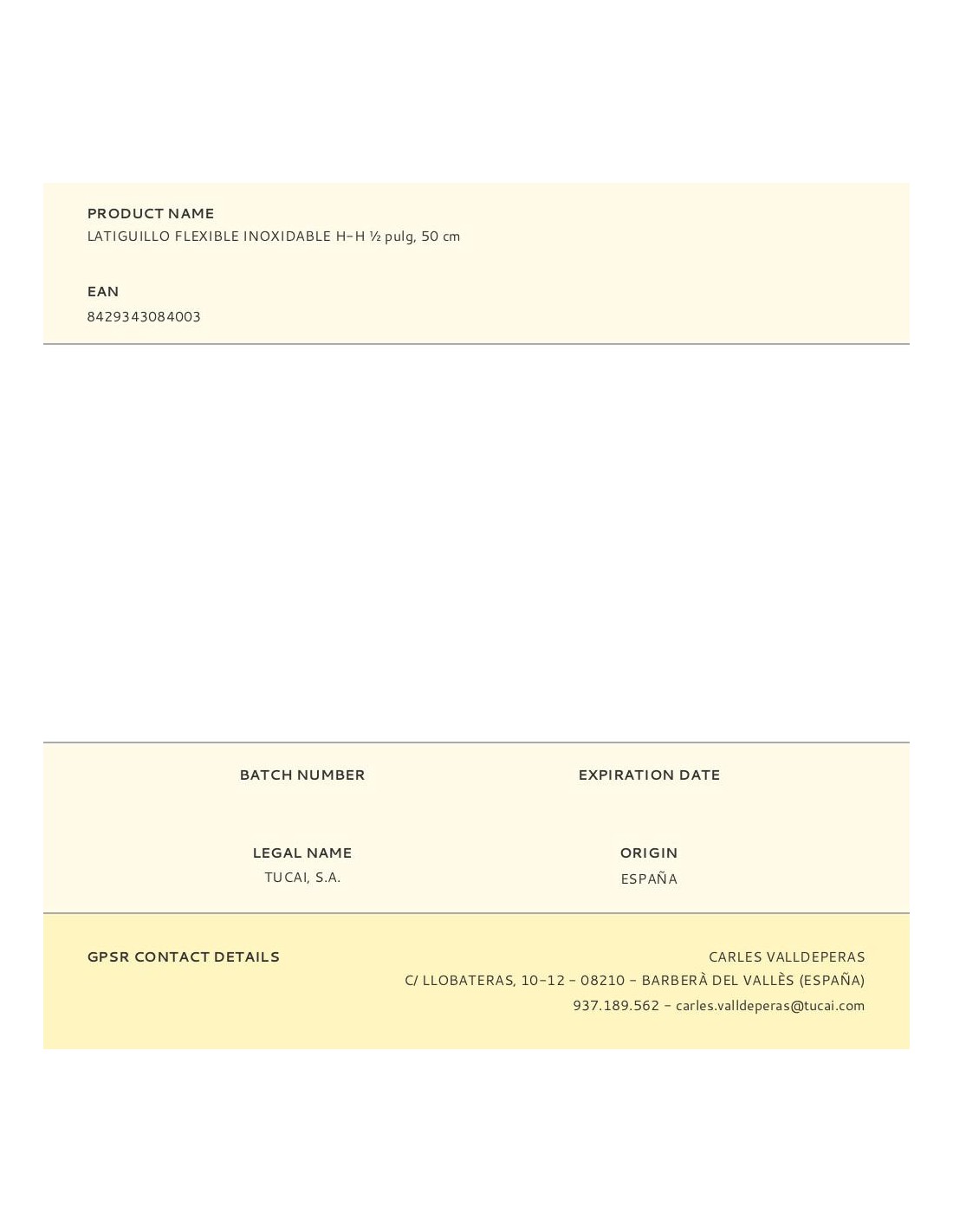 Latiguillo flexible inoxidable sanitario dn8x12 hembra-hembra de ½ pulg de 500 mm de longitud, ø6 mm interior, caudal 28 l/min, máximo 10 bar - 70°c, para agua potable