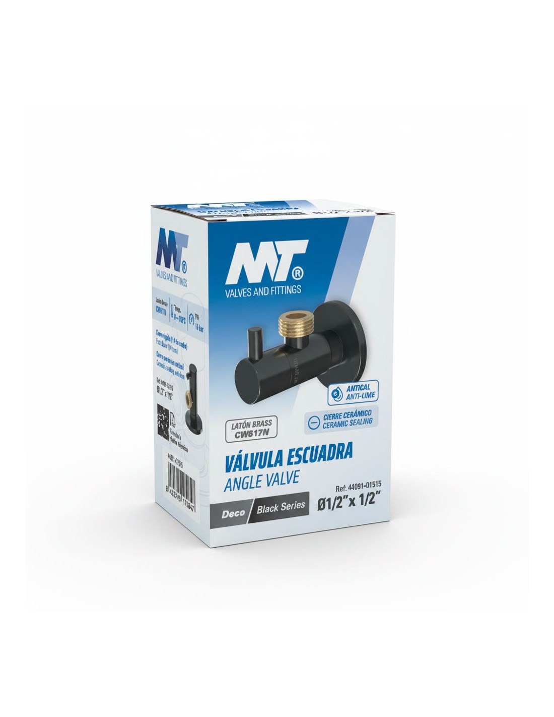 Válvula escuadra modelo deco, color negro, black series, mando redondo, antical, cierre rápido 1/4 de vuelta, cuerpo y pomo de latón, florón de acero inoxidable, cierre cerámico, temperatura de trabajo 0-100 °c, presión máxima a 80 °c: 10 bar 150 psi, presión máxima a 20 °c: 16 bar 230 psi, rosca macho-macho ½ x 3/8 pulg