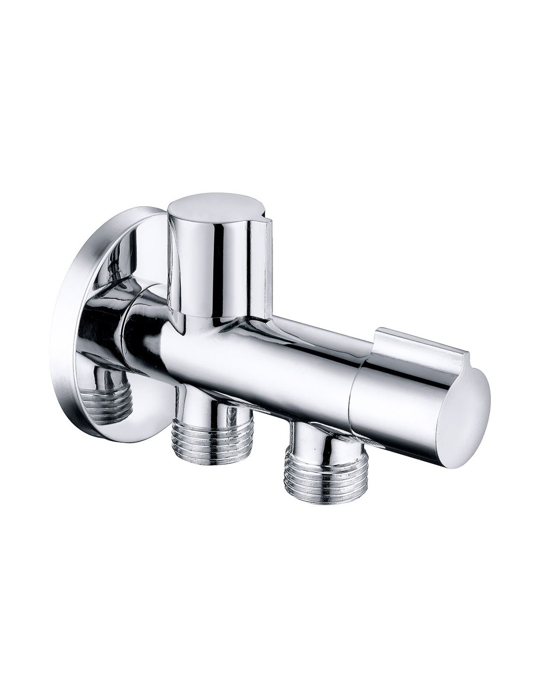 Válvula de escuadra doble salida, fabricada en latón con acabado cromado, maneta metálica, apertura y cierre por montura cerámica. dispone de entrada de ½ pulg y doble salida independiente de ½ pulg. incorpora mandos independientes de apertura rápida con mecanismo de ¼ de vuelta. temperatura máxima 80°c, extremos roscados m-m. dimensiones: 114 × 67 mm