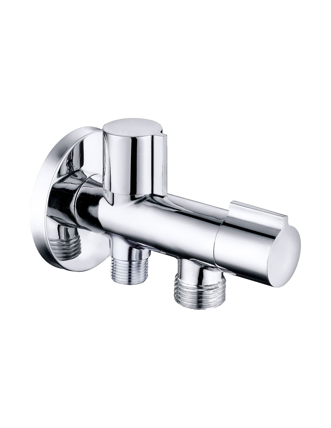 Válvula de escuadra doble salida, fabricada en latón con acabado cromado, maneta metálica, apertura y cierre por montura cerámica. dispone de entrada de ½ pulg y doble salida independiente de ½ pulg y 3/8 pulg. incorpora mandos independientes de apertura rápida con mecanismo de ¼ de vuelta. temperatura máxima 80°c, extremos roscados m-m. dimensiones: 114 x 67 mm