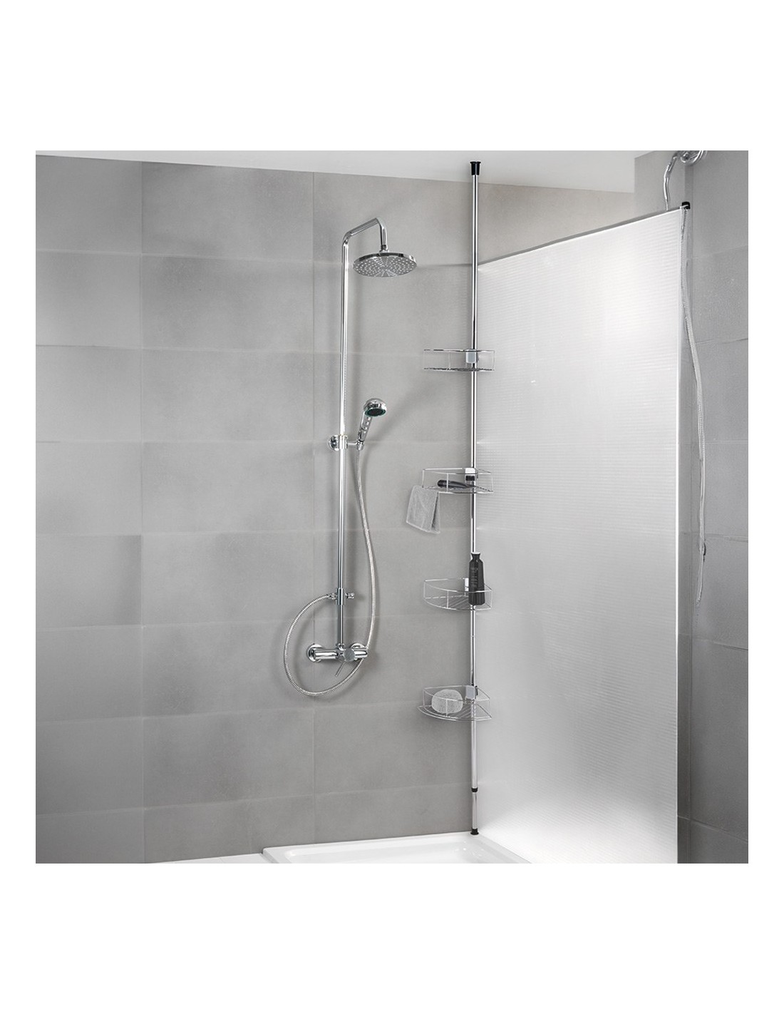 Rinconera telescópica de acero inoxidable, modelo dolcedo, cuenta con 4 cestas de acero inoxidable de 31 x 23 x 7 cm. barra telescópica de ø2,2 x 65- 275 cm. ideal para colocar en la cabina de ducha, esquina de la bañera o en el cuarto de baño