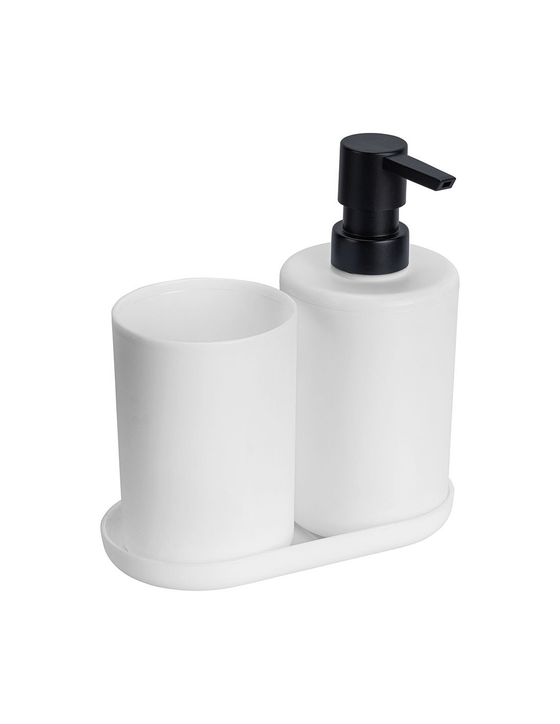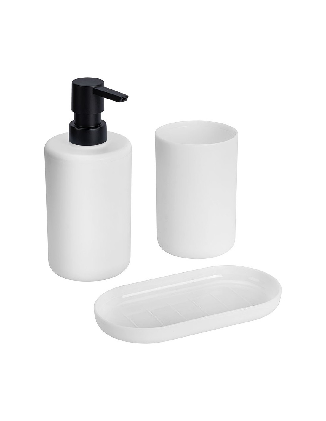 Set de baño, modelo fano, en color blanco, fabricado en plástico. incluye: vaso para cepillos de 350 ml / ø7,6 x 11 cm, dispensador de jabón de 350 ml / ø7,6 x 17,4 cm y jabonera 16 x 1,6 x 8,3 cm