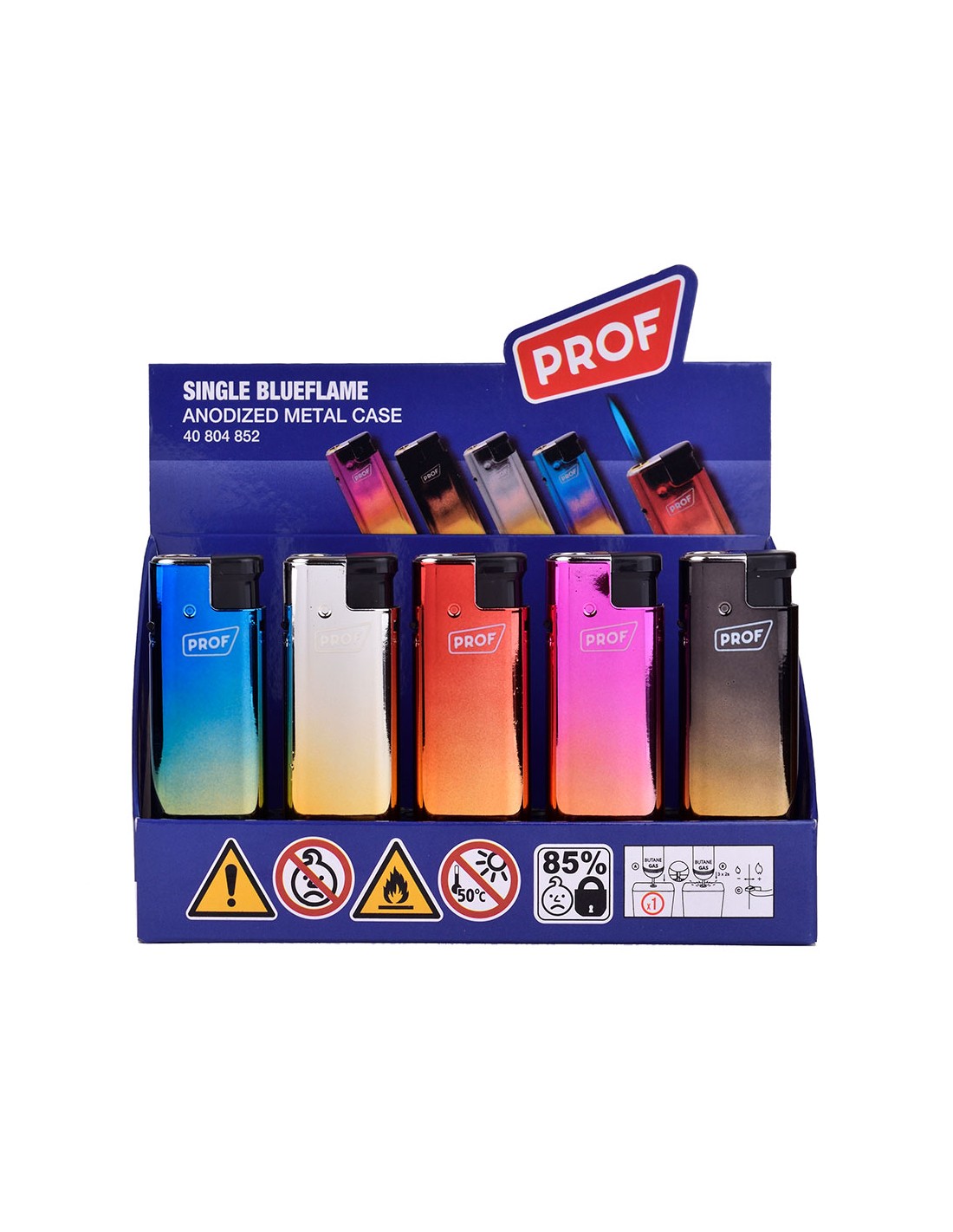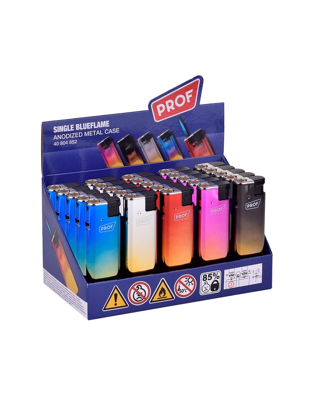 Encendedor electrónico anodized metal case, llama azul, colores surtidos. presentado en expositor de 25 uds