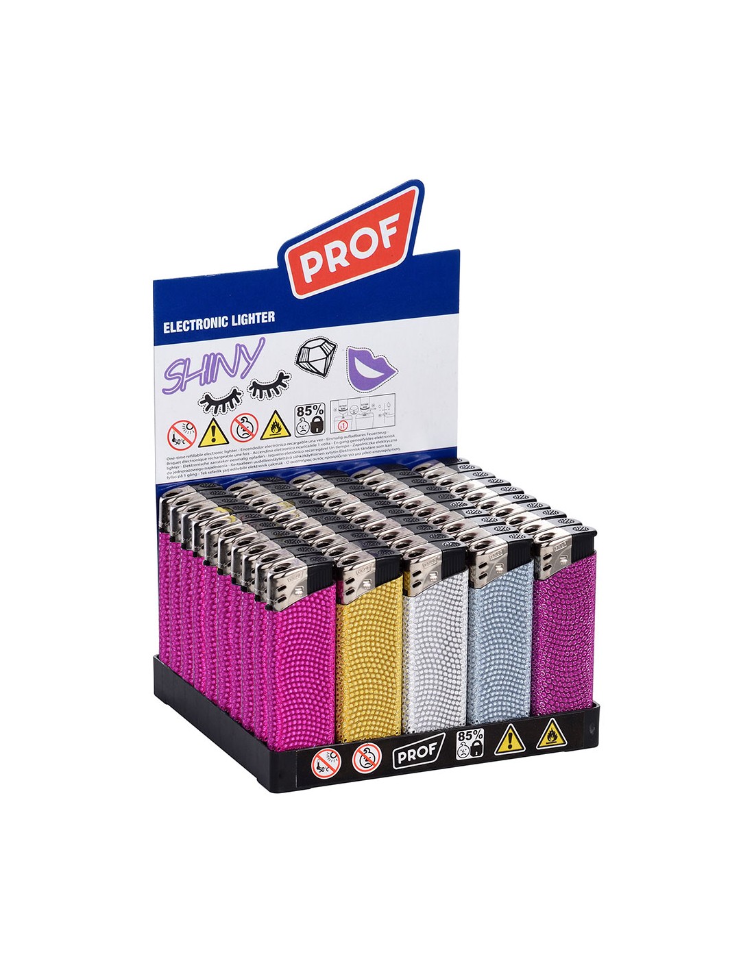 Encendedor electrónico shiny, colores surtidos. presentado en expositor de 50 uds