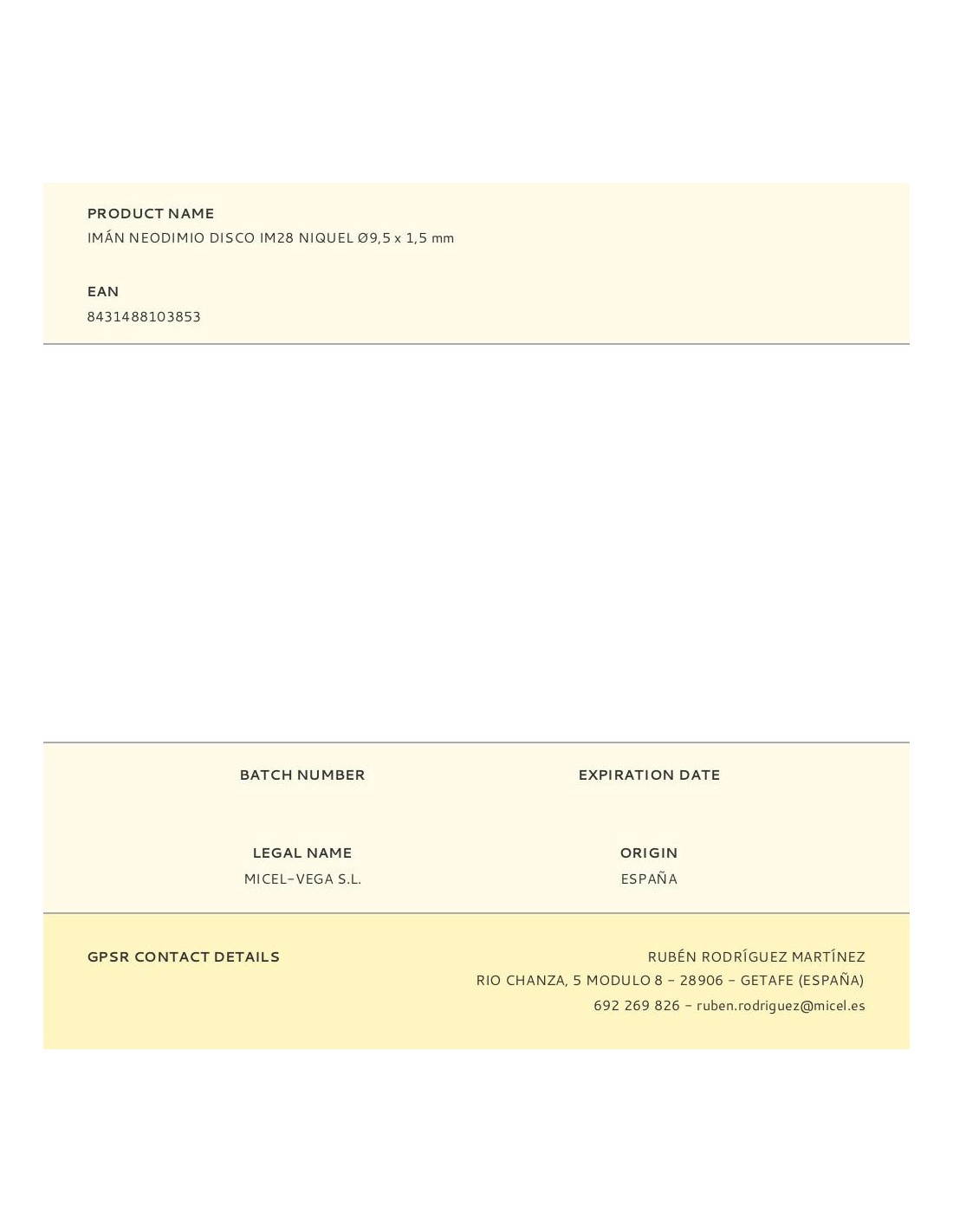 Imán neodimio disco im28 con forma de disco soporta una carga máxima de 0,80 kg magnetización axial gauss 1,8 diámetro de 9,5 mm y espesor de 1,5 mm material neodimio acabado níquel