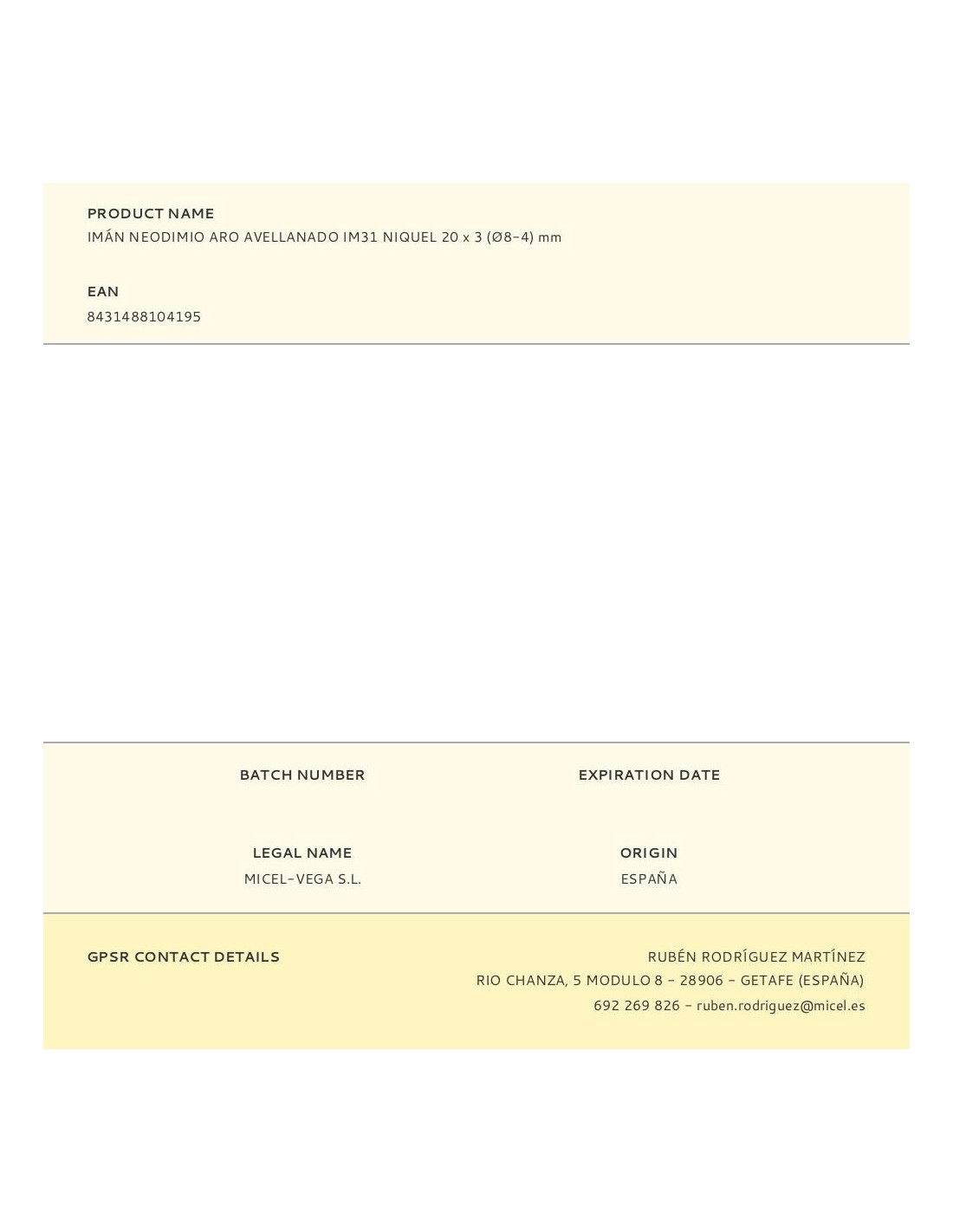 Imán neodimio im31 con forma de aro avellanado soporta una carga máxima de 3,50 kg magnetización axial gauss 2,5 diámetro exterior de 20mm y espesor de 3 mm diámetro interior de 8-4 mm material neodimio acabado níquel