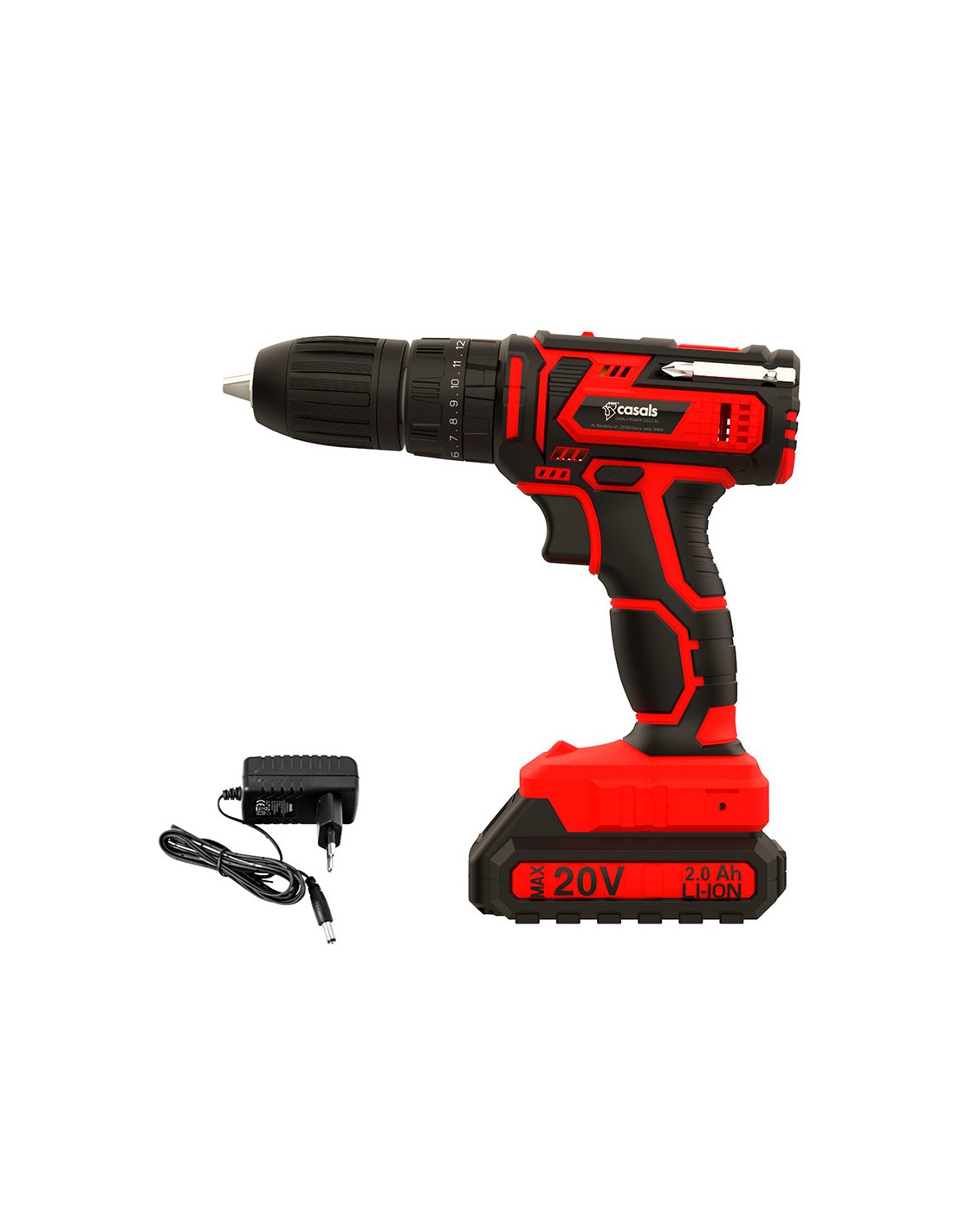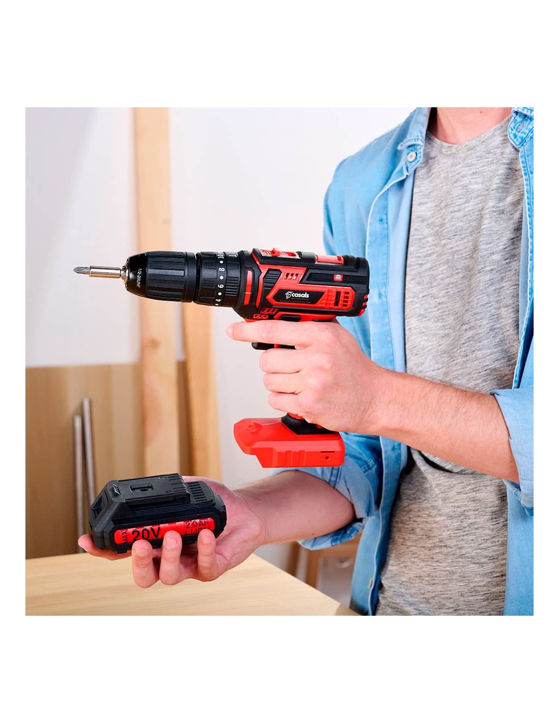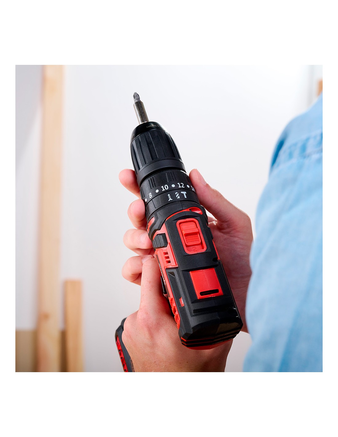 Taladro a batería 20 v. batería de litio 2.0 ah one power lithium 20 v, extraíble e intercambiable con todas las herramientas de la misma gama. carga de la batería: 1 h. 3 funciones: atornillador, taladro y taladro percutor. posiciones de par 18+1+1 fuerza par máximo: 30 nm. 2 velocidades mecánicas: 0-400 / 0-1400 rpm. regulación de velocidad electrónica en el gatillo. portabrocas automático de 13 mm. led de trabajo. función reverse. imán en el lateral para colocar tuercas o adaptadores. perforación máx. en madera: 30 mm. perforación máx. en acero: 13 mm perforación máx. en ladrillo: 10 mm