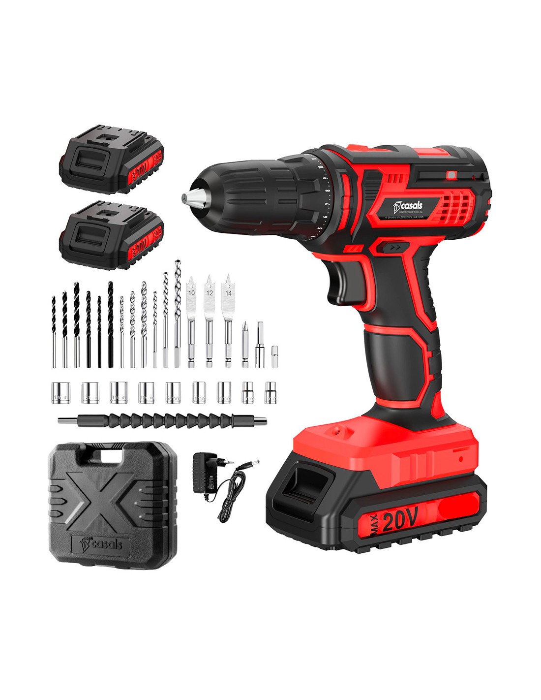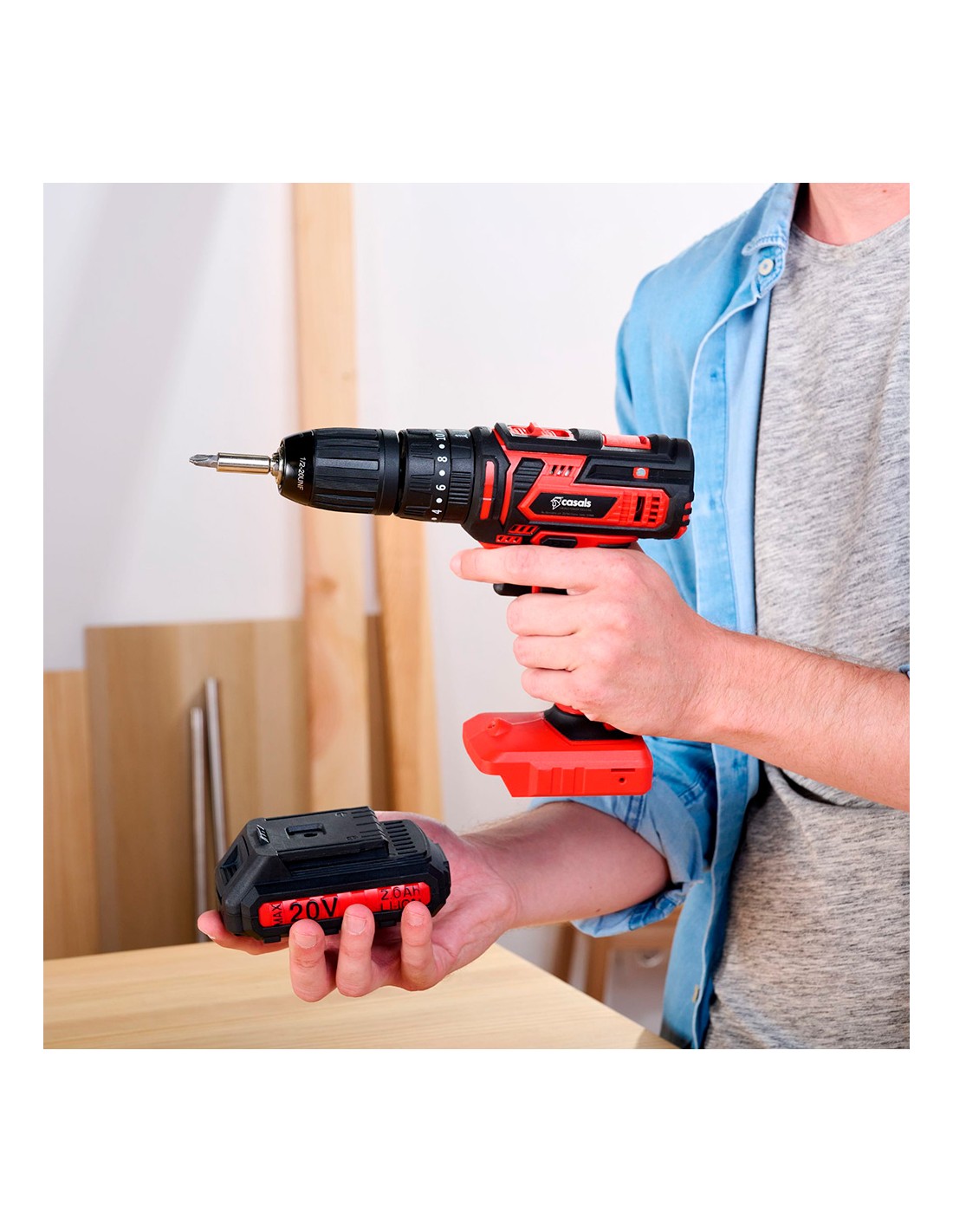 Kit maletín taladro percutor a batería 20 v. batería de litio extraíble one power lithium 2000 mah. carga de la batería en 1 h. 2 velocidades mecánicas. velocidad 1: 0-400 rpm. velocidad 2: 0-1400 rpm. regulador de velocidad electrónico fuerza máxima: 35 nm. posiciones par de apriete: 18+1+1 máx. madera 20 mm, máx. acero 10 mm, máx. ladrillo 10 mm, portabrocas 10 mm. iluminación led en la zona de trabajo. función reverse. contenido: maletín con taladro, cargador, 2 baterías y accesorios