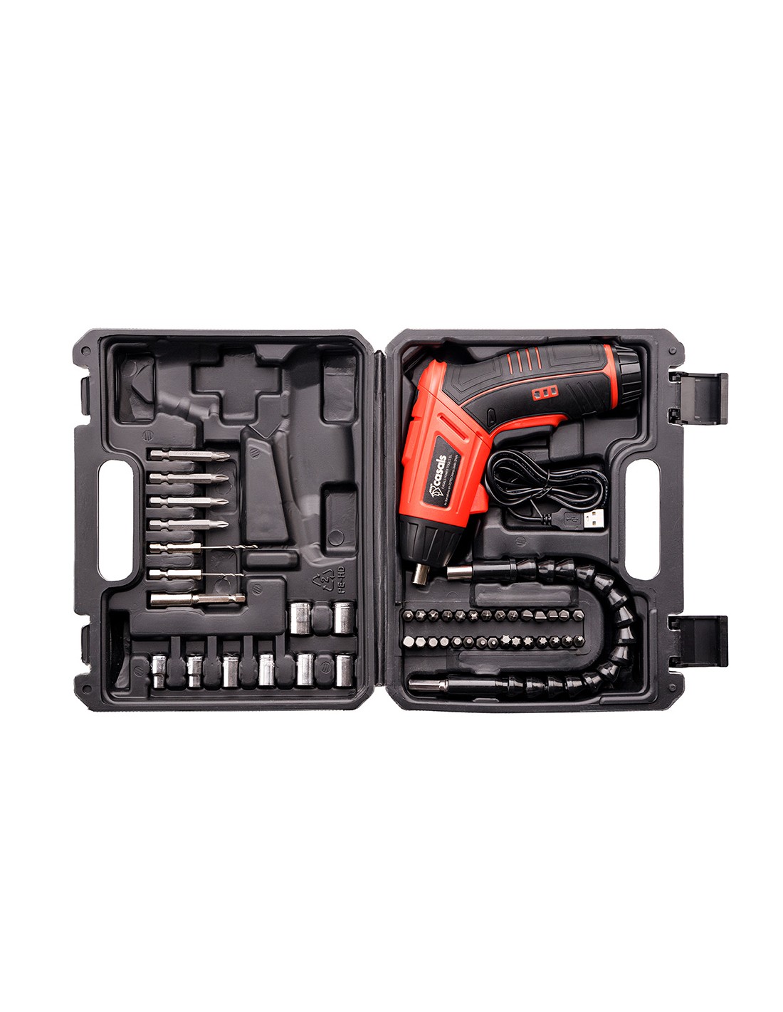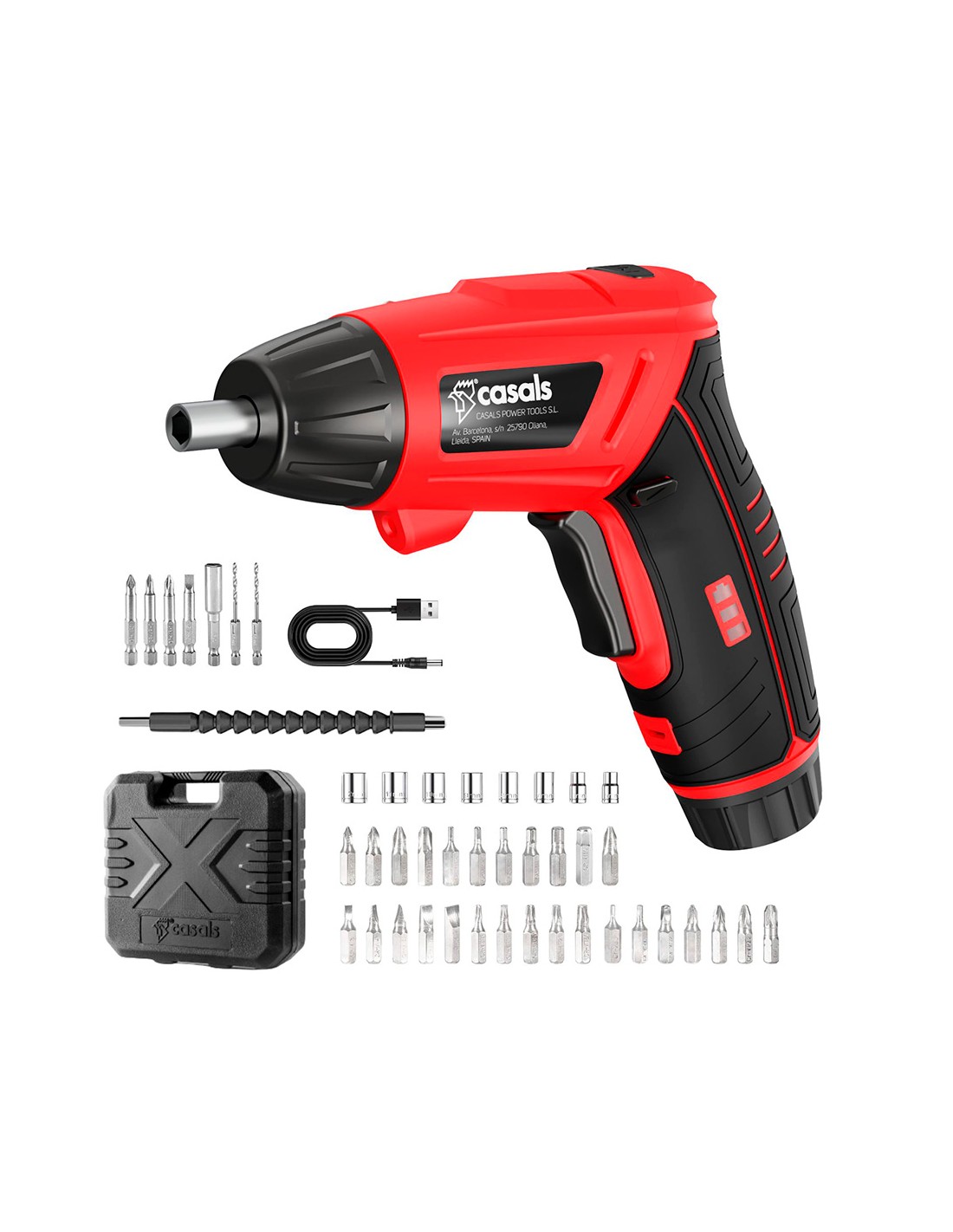 Atornillador a batería. 3,6 v, 200 rpm, batería de litio 2000 mah. iluminación led en la zona de trabajo. indicador de capacidad de la batería. mango rotatorio. linterna en la base del atornillador. incluye maletín con 34 puntas de atornillado, 8 llaves, 1 eje de perforación flexible, adaptador hexagonal y cable usb