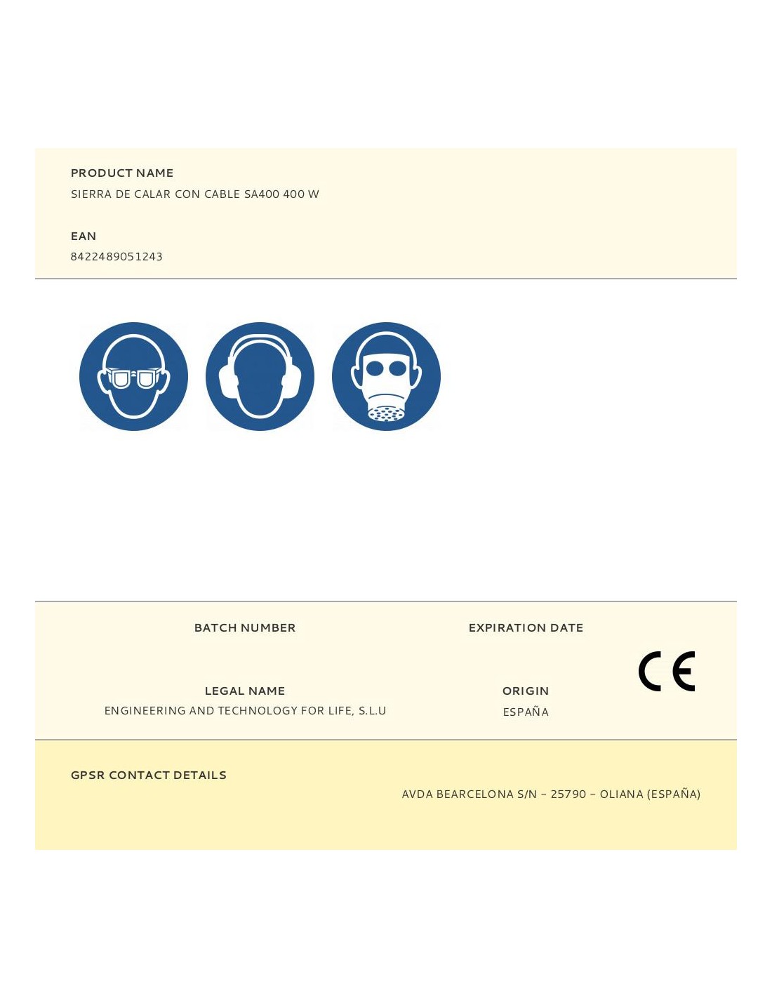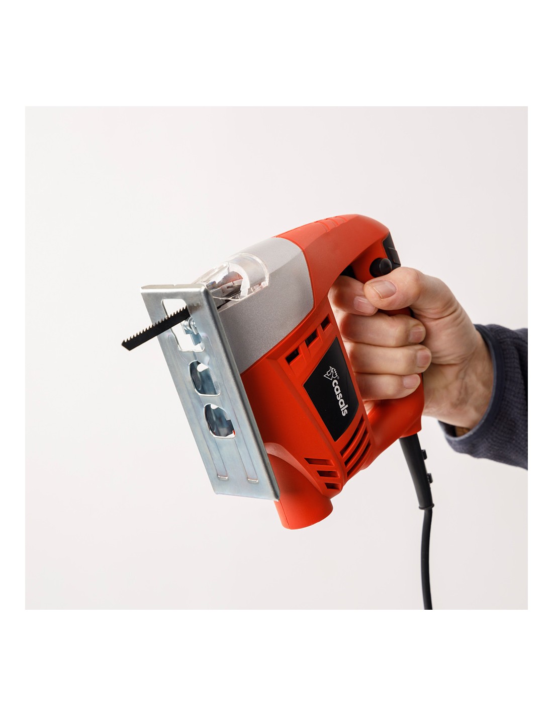 Caladora. potencia: 400 w, 230 - 240 v, velocidad en vacío: 3000 rpm, capacidad de corte en madera: 55 mm, capacidad de corte en acero: 4 mm, capacidad de corte en aluminio: 8 mm. mango ergonómico con revestimiento soft touch, botón de bloqueo de funcionamiento, cortes a inglete hasta 45° hacia derecha e izquierda, cortes rasantes, suela móvil hacia los laterales y hacia adelante, apta para hojas de corte con anclajes en "t" y en "u". cable de 2 m. accesorios incluidos: sierra de corte universal, adaptador para aspirador, llave allen y escobillas