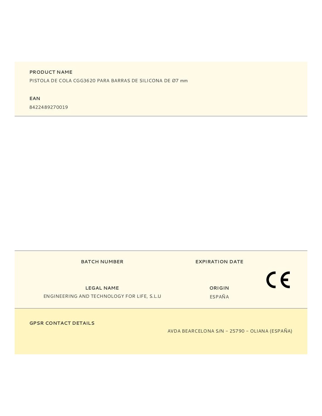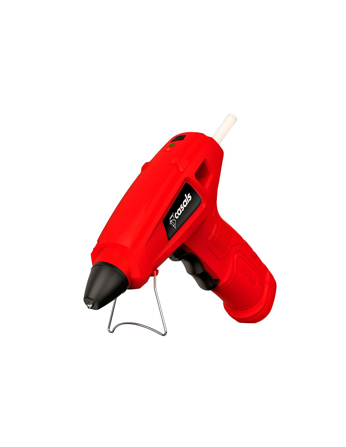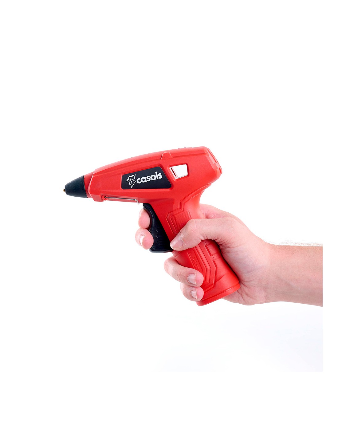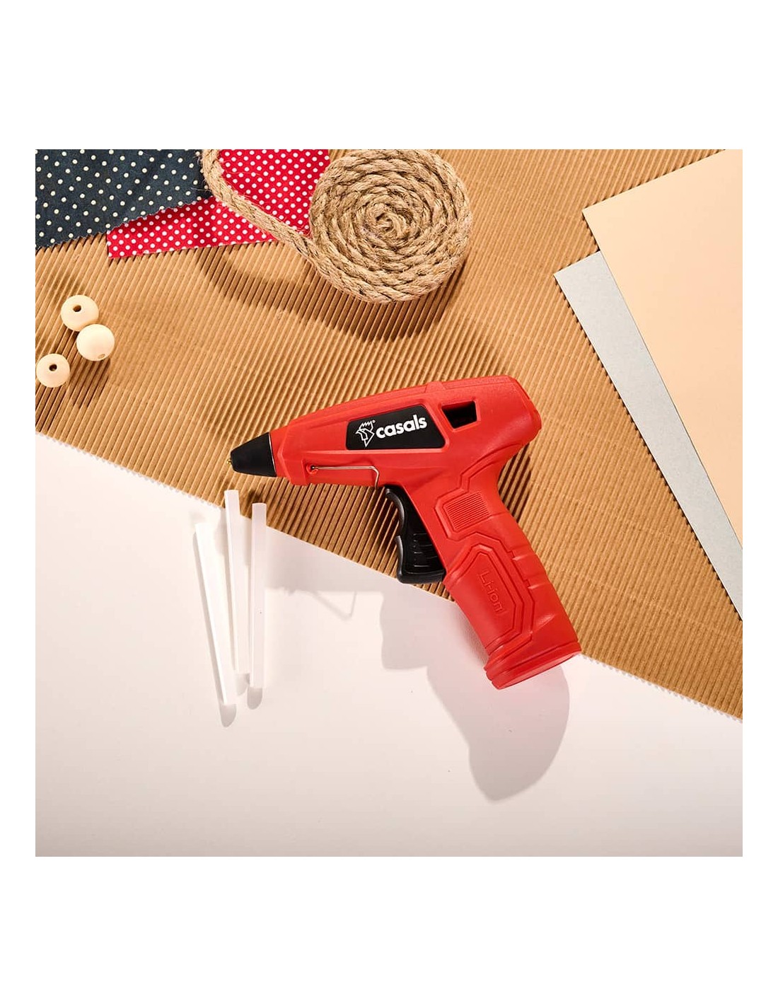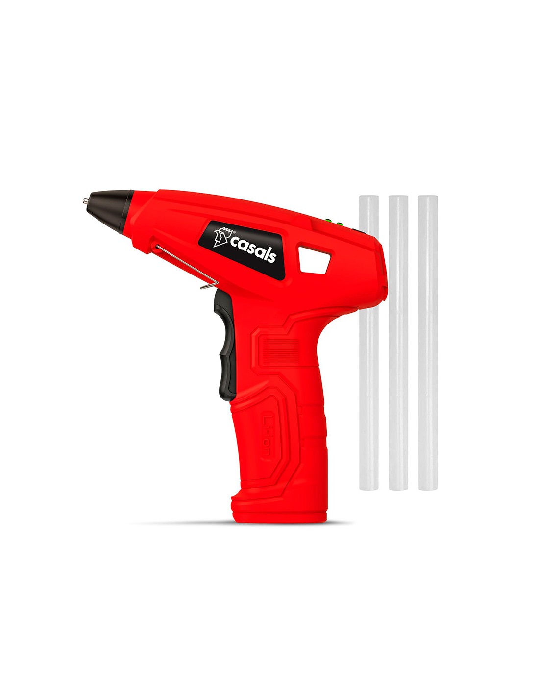 Pistola de silicona con batería de 4 v, ion-litio, 13000 mah, tiempo de carga 3 h, tiempo de trabajo 30 min. para barras de silicona de ø7 mm, tiempo de calentamiento 15 segundos, apagado automático de seguridad tras 5 minutos, mango ergonómico. con soporte metálico plegable. incluye cable de carga usb micro y 3 barras de silicona