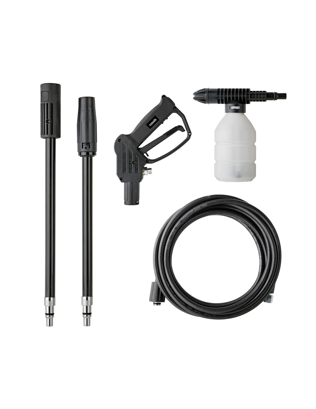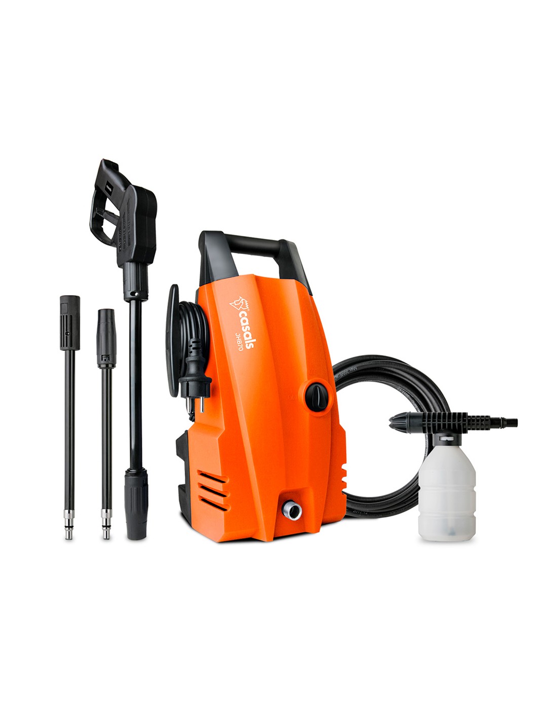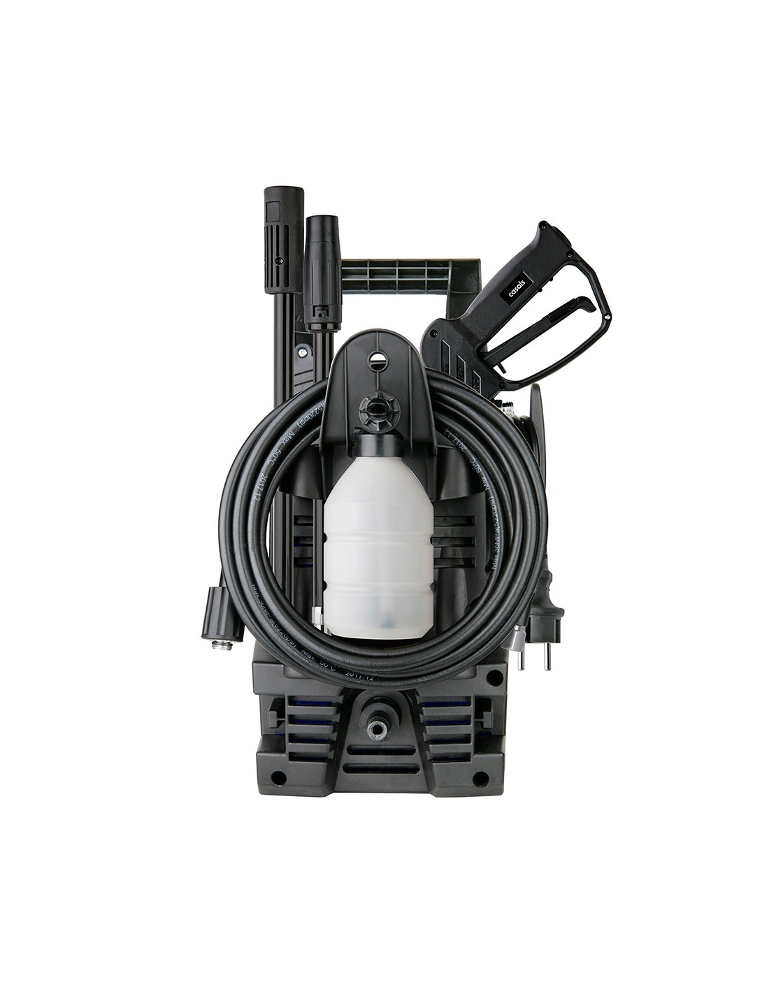 Hidrolimpiadora 1400 w, presión máx: 105 bar, caudal máx: 6,2 l/min. deposito externo para detergente/jabón, manguera de alta presión: 5 m, cable eléctrico: 5 m. regulación de la presión con la boquilla de pulverización ajustable con un ángulo de spray de 0-60: lanza desmontable para un fácil almacenamiento