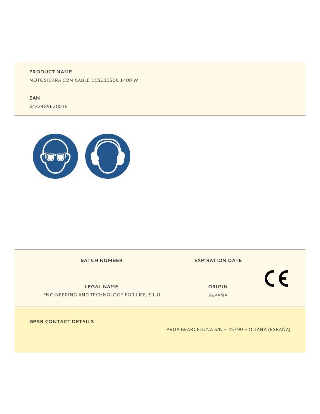 Motosierra con cable ccs23050c 1400 w 230 - 240 v ~ 50 hz, diseñada para cortes precisos en madera. longitud de corte de 35,5 cm, ø 45 mm máx de corte y una velocidad de 5.500 rpm, es ideal para trabajos de jardinería y mantenimiento, ofreciendo resultados profesionales con facilidad