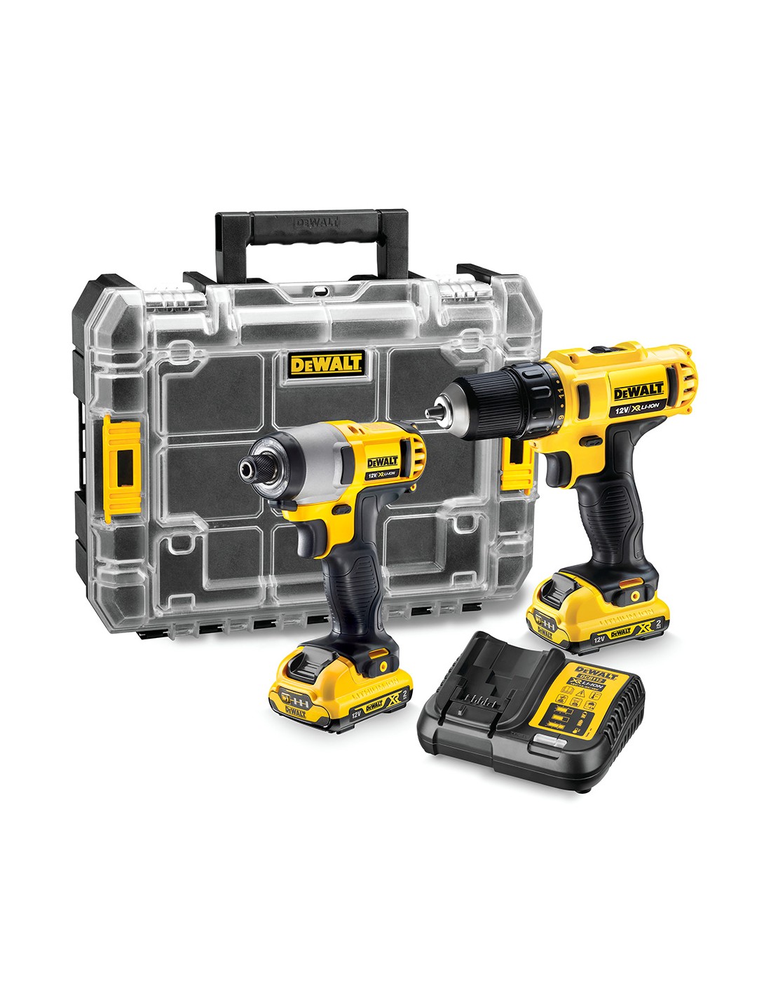 Taladro/atornillador: potente herramienta de 12 v con 15 posiciones de par y portabrocas de 10 mm. su empuñadura ergonómica y gatillo sensible aseguran un control preciso, mientras que las 2 velocidades variables ofrecen un rendimiento óptimo en todas las aplicaciones. atornillador de impacto: diseño compacto y duradero con 107 nm de par. cuenta con un portabrocas de 6,35 mm sin llave para cambios rápidos y 3 luces led para mayor visibilidad. incluye: el kit viene en un organizador tstak v con dos baterías de litio xr de 2,0 ah y un cargador