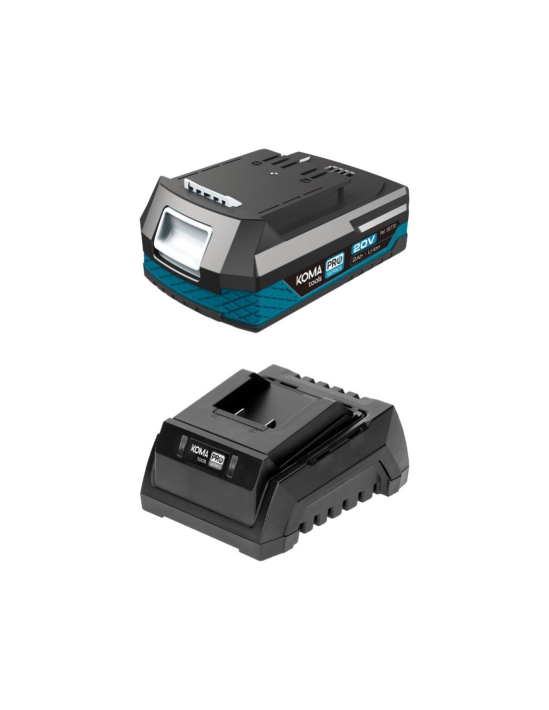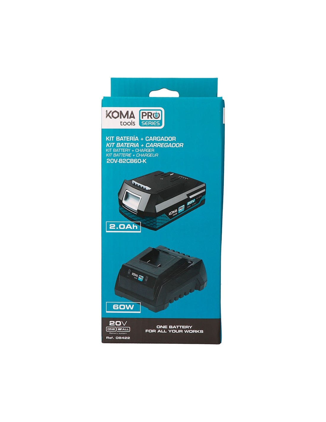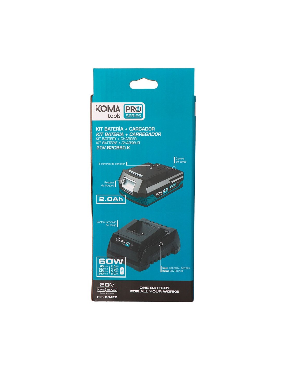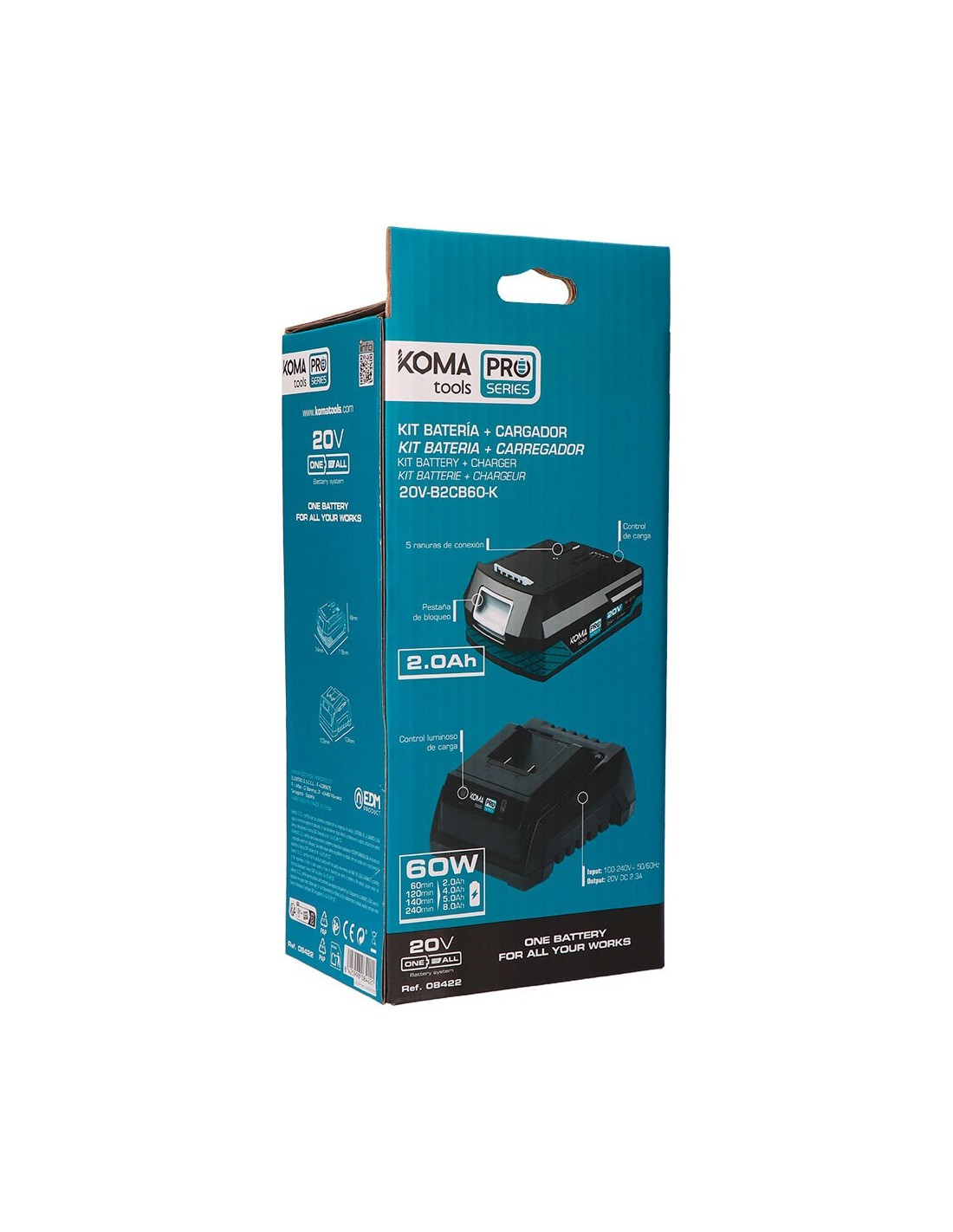 Pack de batería li-ion (08770) de 20 v 2,0 ah, con indicador de carga, 20 v-b2, 11,8 x 7,4 x 4,8 cm, y cargador de batería (08772) 20 v 60 w 2,3 a, 100-240 v~ 50/60 hz, con indicador de carga. tiempo de carga: batería de 2,0 ah 60 min - batería de 4,0 ah 120 min, batería de 5,0 ah 140 min, batería de 8,0 ah 240 min, 20 v-cb60, 10,3 x 13,4 x 7 cm, totalmente compatibles entre toda la gama koma tools