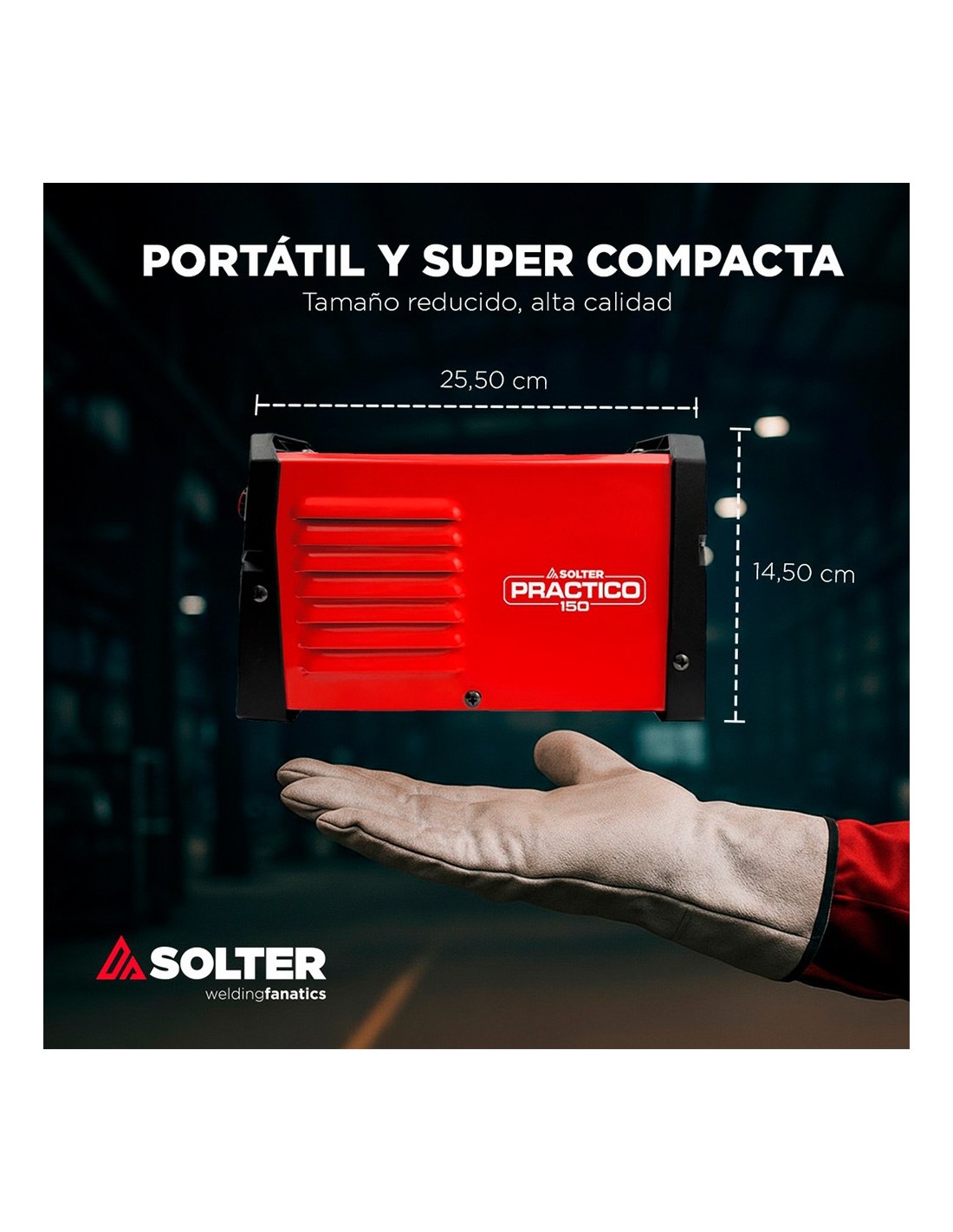 Soldador inverter práctico 150 ld (2,2 kg). combina alto rendimiento y diseño compacto. incluye maletín de transporte y correa. garantiza un arco estable y una eficiencia del 80 % (factor de potencia 0.65). funciones mma y lift tig con electrodos de ø2,5 y ø3,2 mm. ciclo de trabajo (40°c 10min): 40% 150a, 60% 100a y 100% 80a. tensión de alimentación 220v±10%, potencia consumida 4.6 kw (mma) / 2.68 kw (tig). sistema vrd y panel digital. dimensiones: 255 x 110 x 145 mm