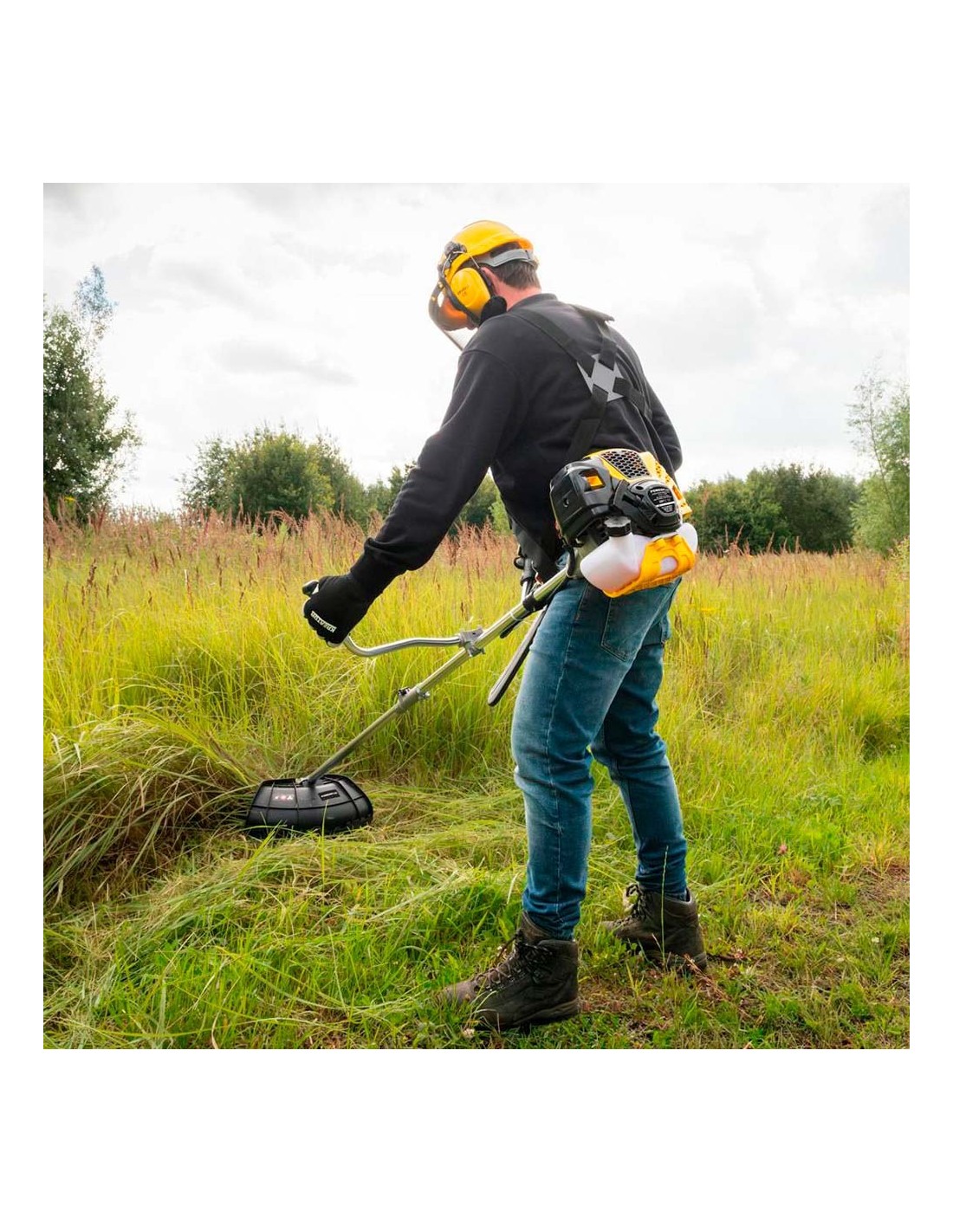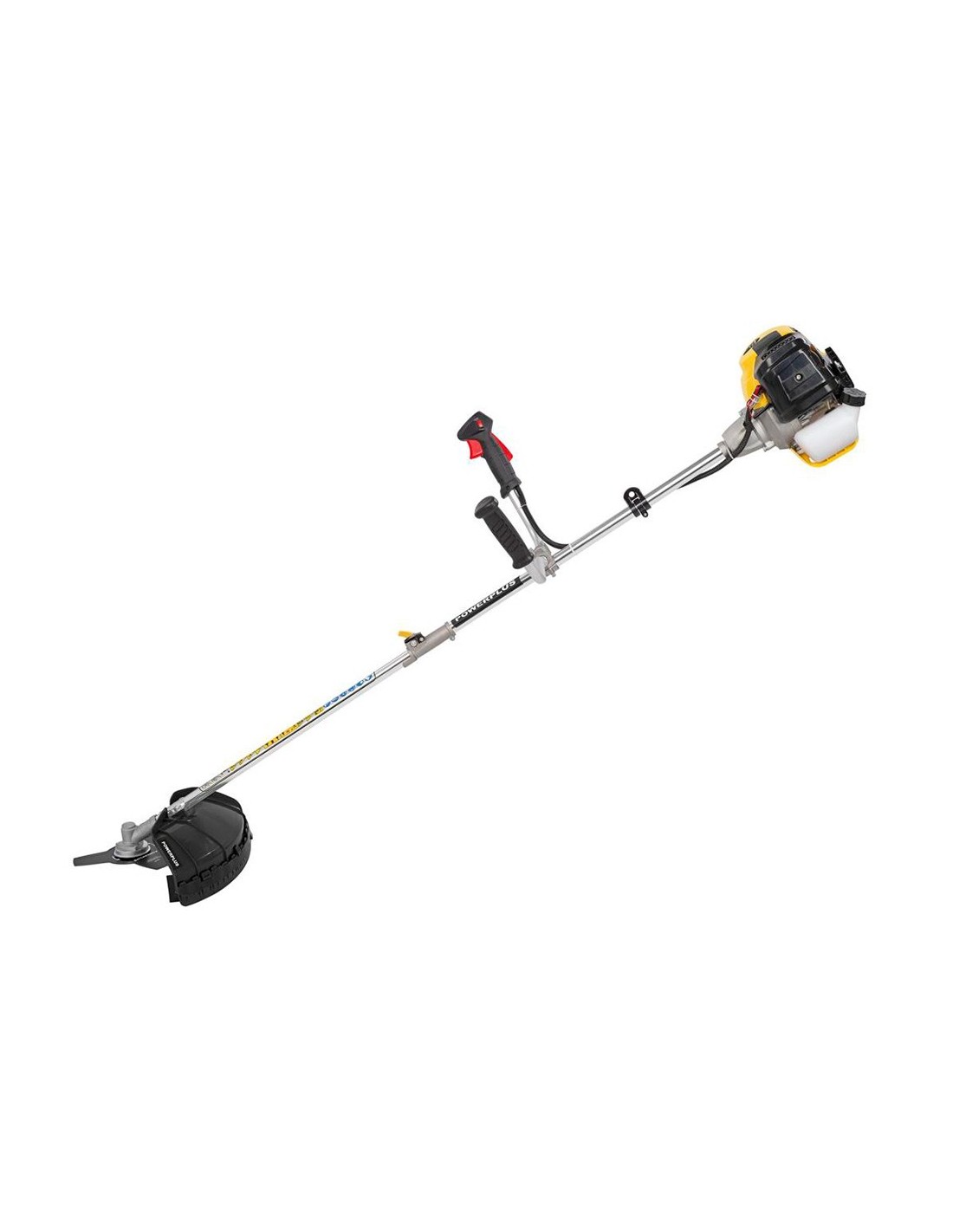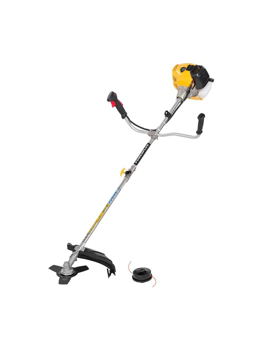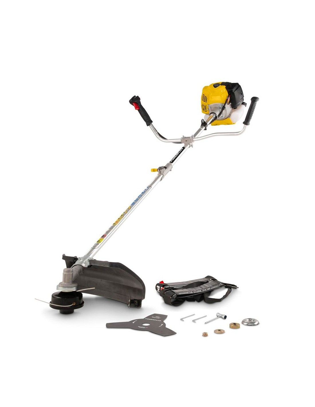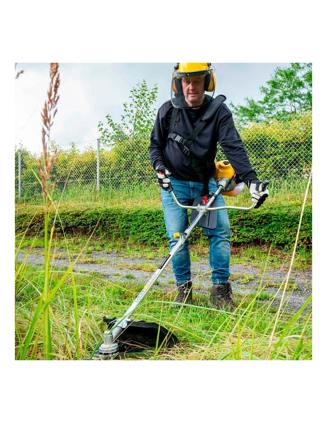 Desbrozadora 42,7 cc de gasolina para arbustos gruesos y pastos cubiertos donde una cortadora de césped no puede atravesar. diámetro de corte de 460 mm y 8.000 rpm con el carrete de corte y diámetro de 255 mm y 8.500 rpm con la cuchilla de corte. con sistema de reducción de vibración y sistema tap & go que alarga el hilo de corte de forma automática. ligero y fácil de transportar. mango ergonómico. nivel de potencia sonora hasta 110 db. incluye carrete y disco de corte, llave de bujía, mango de guía, botella vacía de 950 ml, 2 sujetacables, 2 llaves hexagonales, destornillador, cuchilla de corte y arnés de hombro