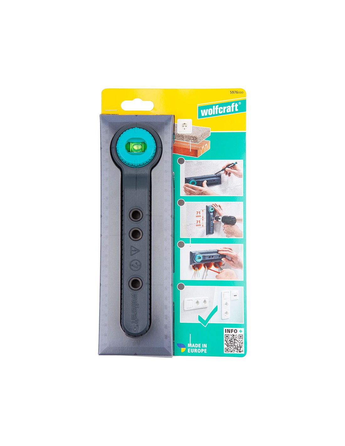 Plantilla de perforación electricidad", para medidas de 71 y 91mm 5976000 wolfcraft plantilla para marcar, alinear y taladrar para la instalación de interruptores y cajas de enchufe en paredes de ladrillo.nivel de burbuja con giro de 90° para una alineación horizontal y vertical de la plantilla de marcado preciso de la posición del taladro y para alinear las cajas de instalación y los insertos. marcas de 71 y 91mm para transferir cómodamente las distancias correctas entre dos cajas de instalación, así como cajas de enchufe y cajas de tv o red. manual de instrucciones paso a paso con ilustraciones para el uso correcto de la plantilla para una instalación cómoda y segura."