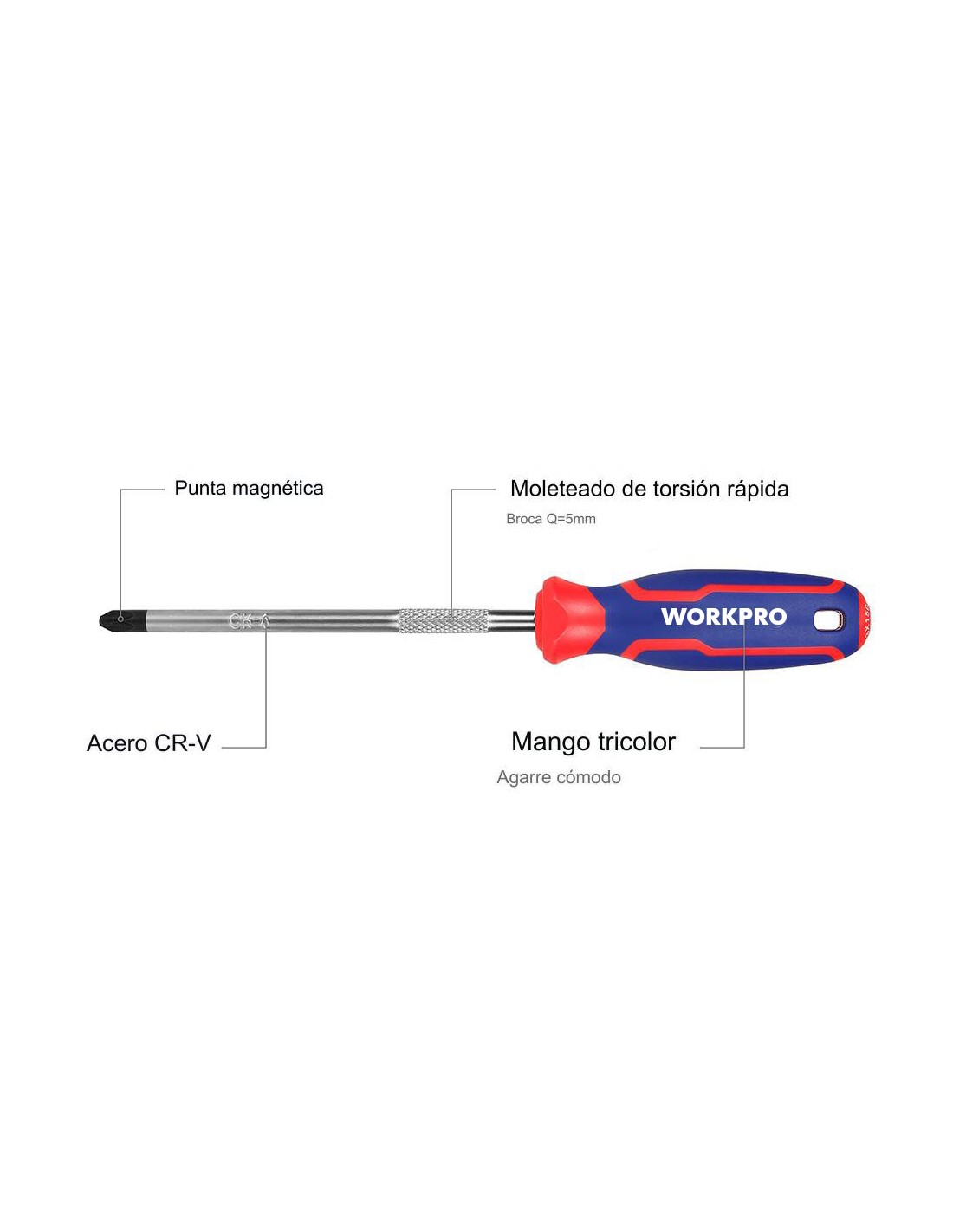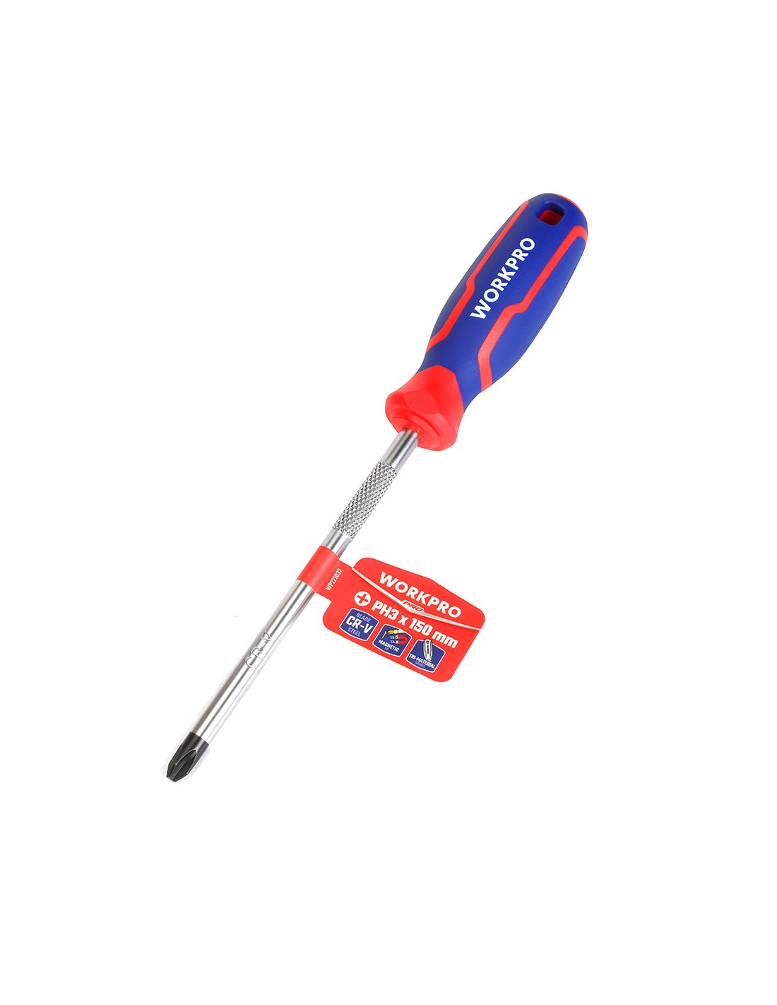 Destornillador phillips cr-v con mango tricolor, ph3x150mm. hoja de cromo-vanadio. punta magnética negra. mango ergonomico de agarre cómodo. workpro