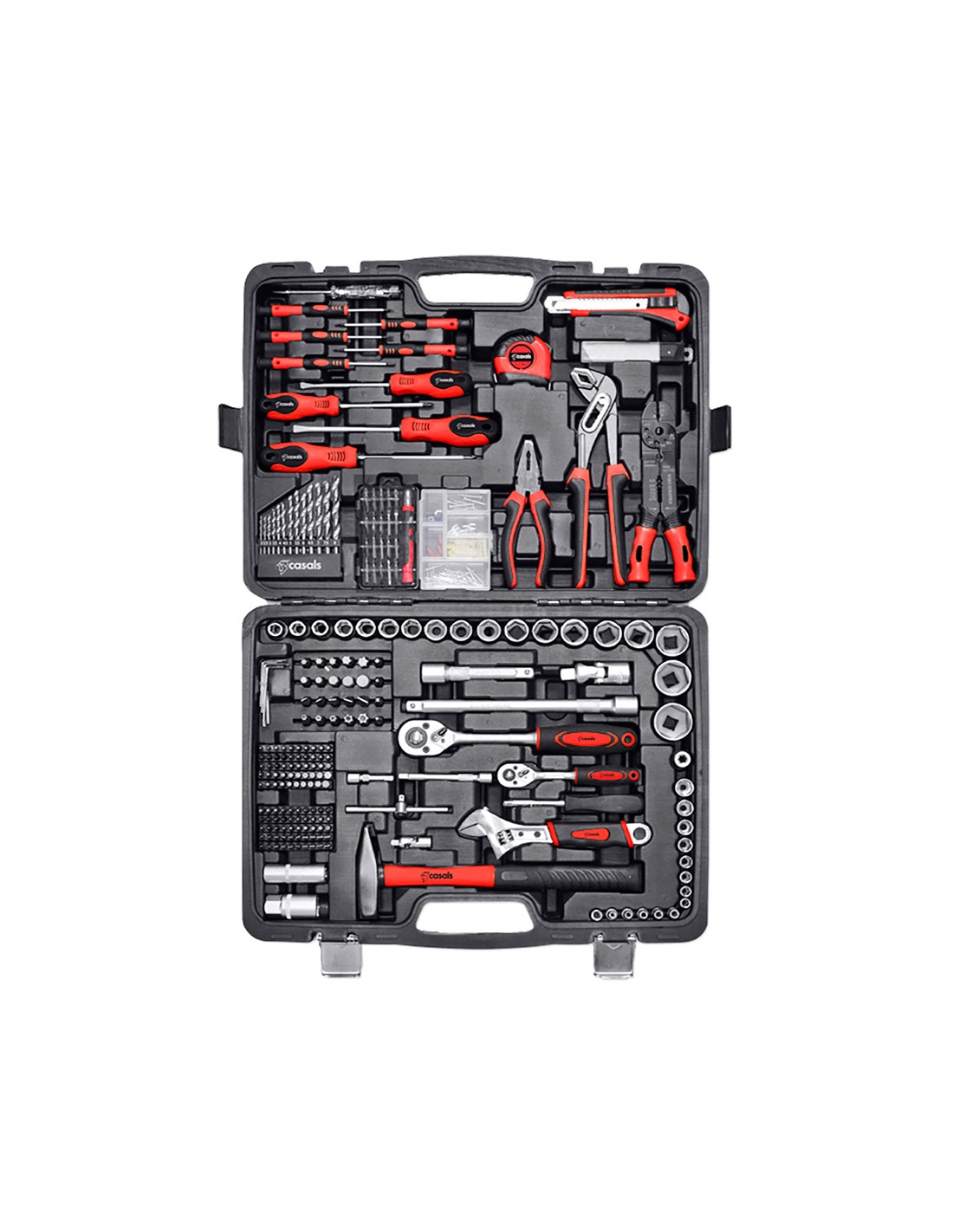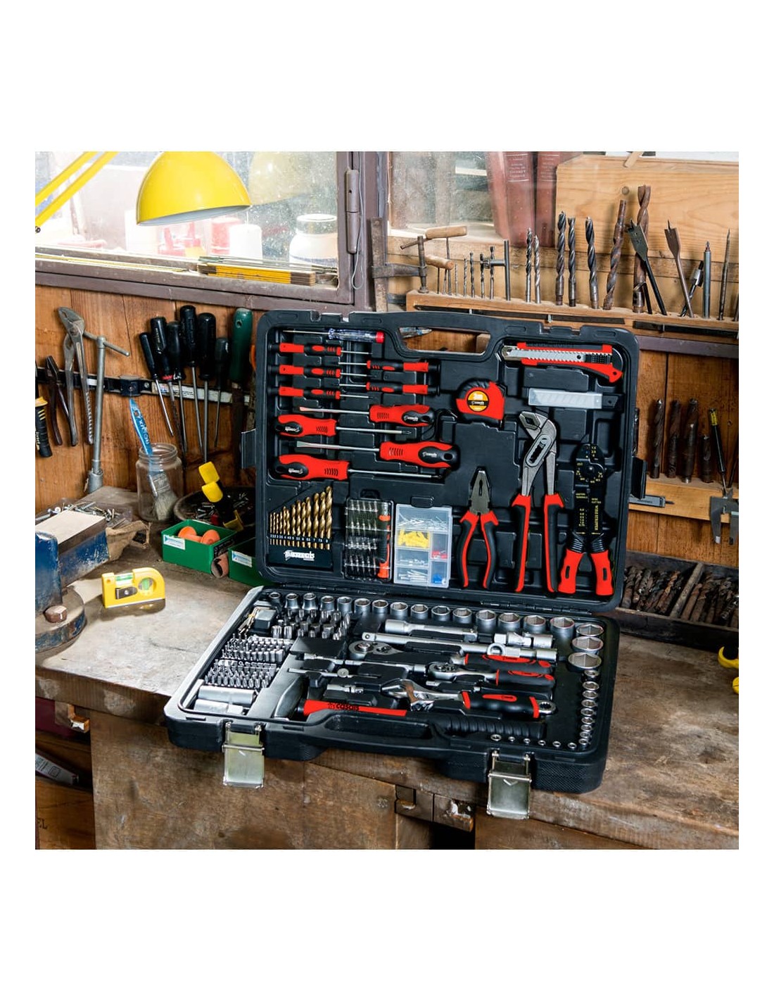 Maletín de herramientas de 303 piezas para todo tipo de trabajos. juego completo de llaves de vaso de ¼ con llaves de 4 a 14 mm, juego completo de llaves de vaso de ½ con llaves de 10 a 32 mm. cada juego de llaves cuenta con carracas, cardán y prolongaciones. incluye otras herramientas: cinta métrica, destornilladores de taller y de precisión, llave inglesa, martillo, detector de tensión, cúter y alicates universales, extensibles y de apriete cuenta con un amplio surtido de piezas pequeñas: tornillos, clavos, gomas y terminables de cable. material de acero al cromo-vanadio. maletín robusto y resistente. intercambio fácil, rápido y cómodo de los accesorios. medidas: 50 x 39 x 8,5 cm
