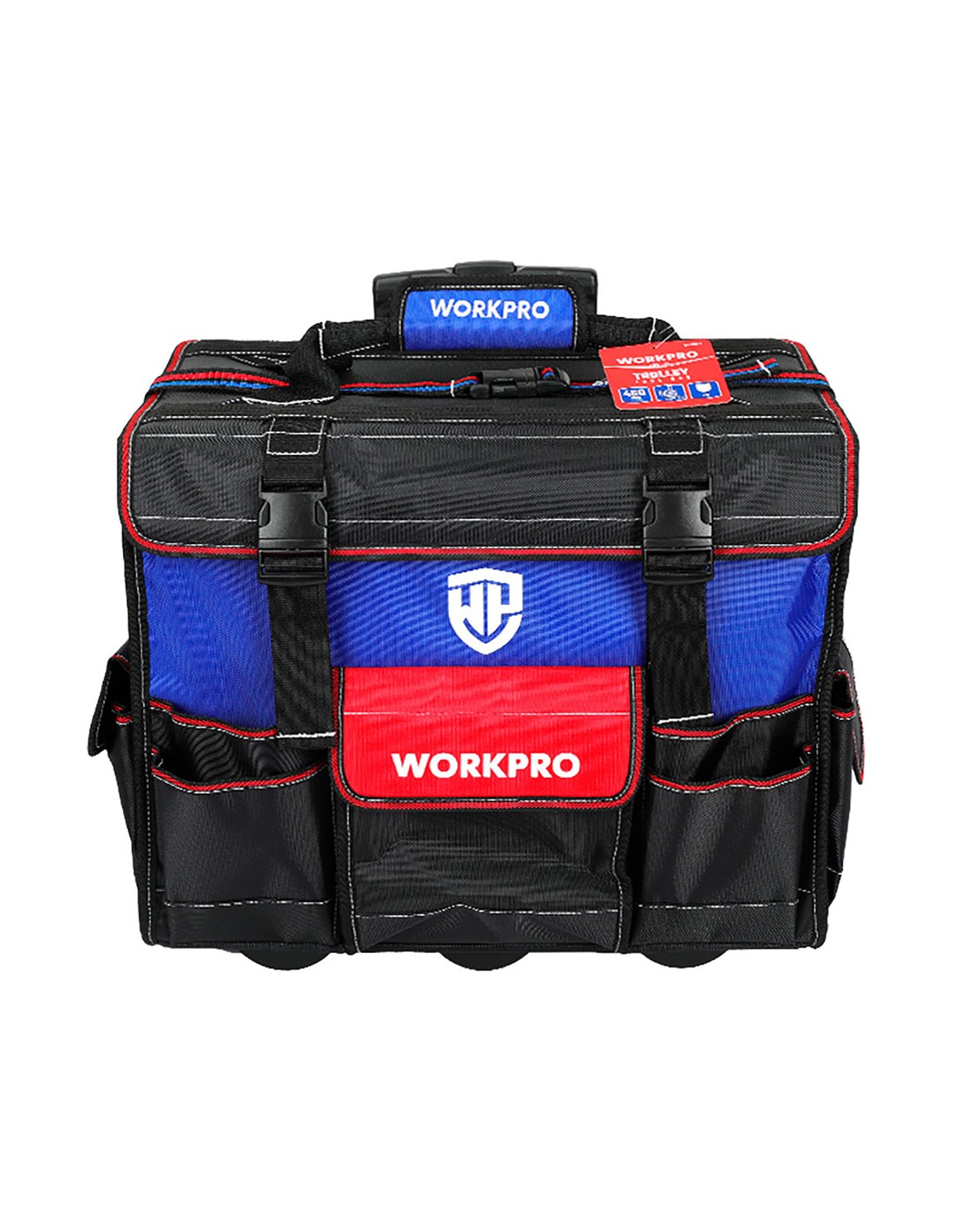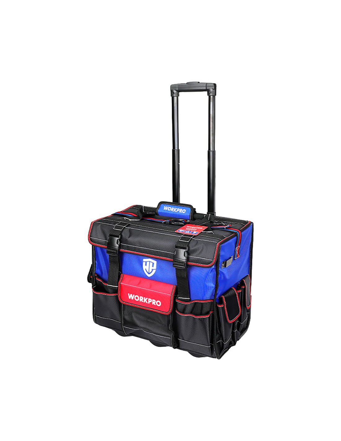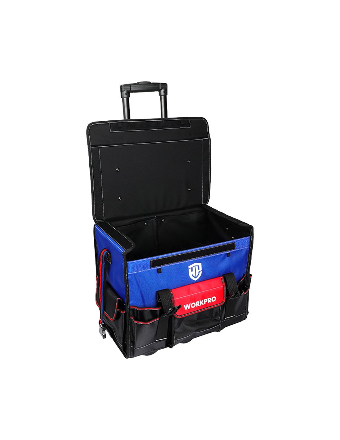 Bolsa de herramientas rígida, hecha de poliéster reforzado, con bolsillos interiores, frontales y laterales con cierre en velcro, asas con protector de velcro y estructura robusta con ruedas, negra, azul y roja, 46 x 27 x 40 cm