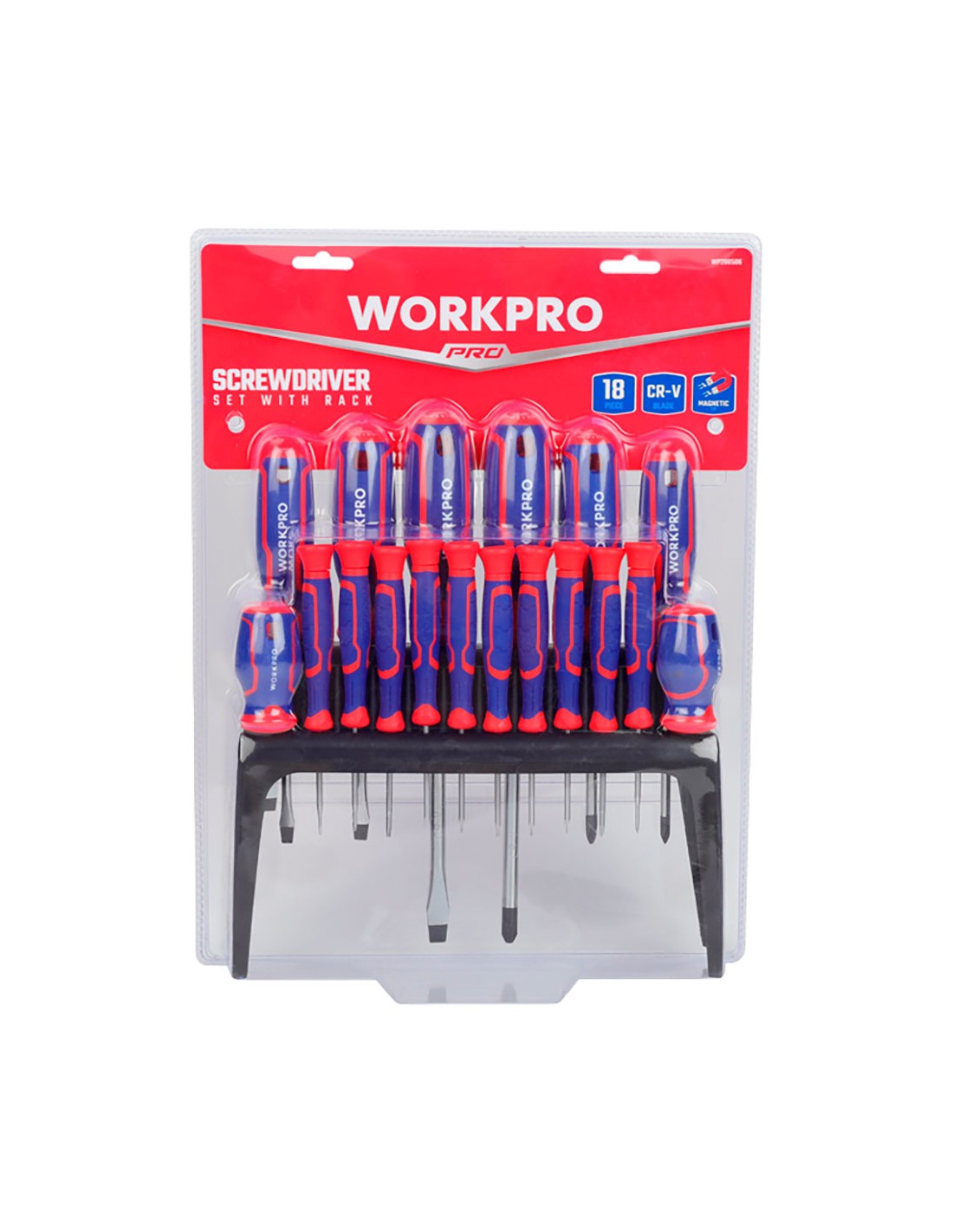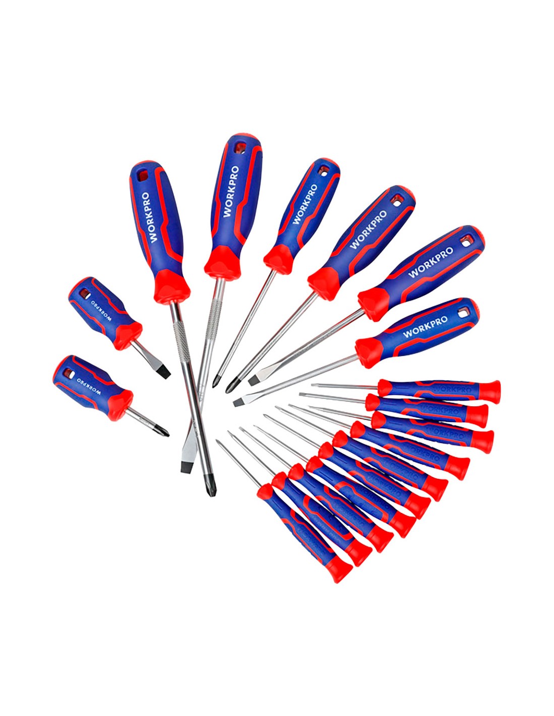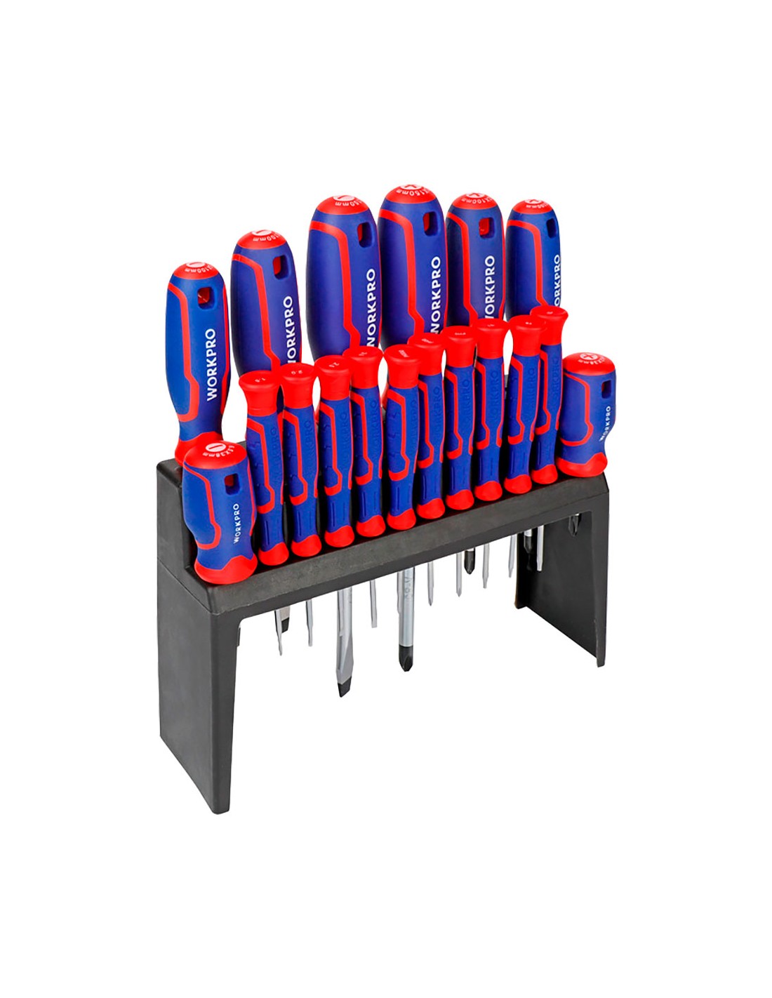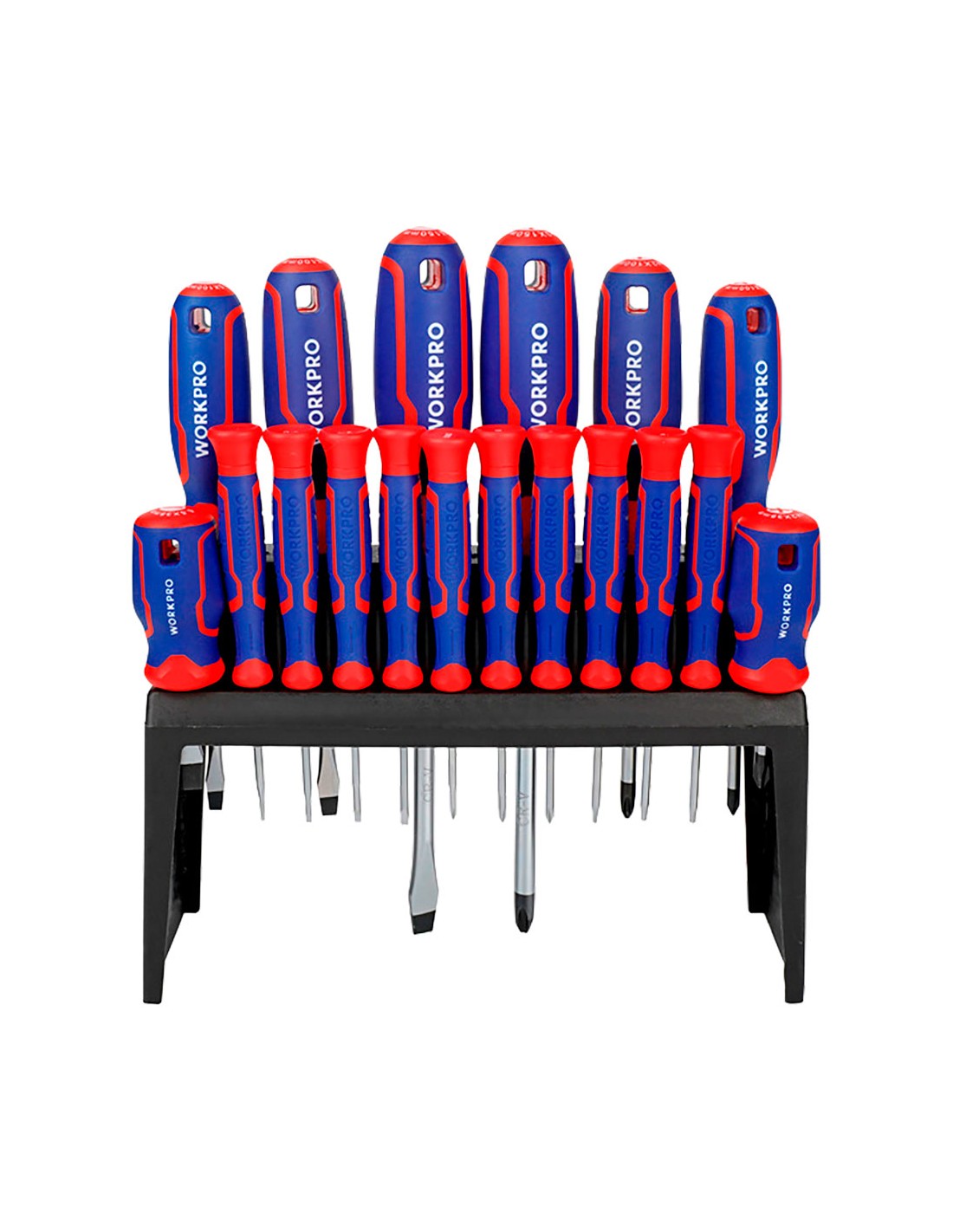Juego 18 destornilladores. cuerpo de cromo vanadio. punta magnética fosfatada. mango ergonómico confortable. incluye 10 destornilladores de precisión: : ph0, ph00, ph000, t7, t8, t9 1,5 mm 2 mm 2,5 mm 3 mm. 8 destornilladores: 6,5 x 38 mm, 5,5 x 100 mm, 6,5 x 100 mm, 8 x 150 mm, ph2 x 38 mm, ph1 x 100 mm, ph2 x 100 mm, ph3 x 150 mm. azules y rojos con soporte de plástico negro