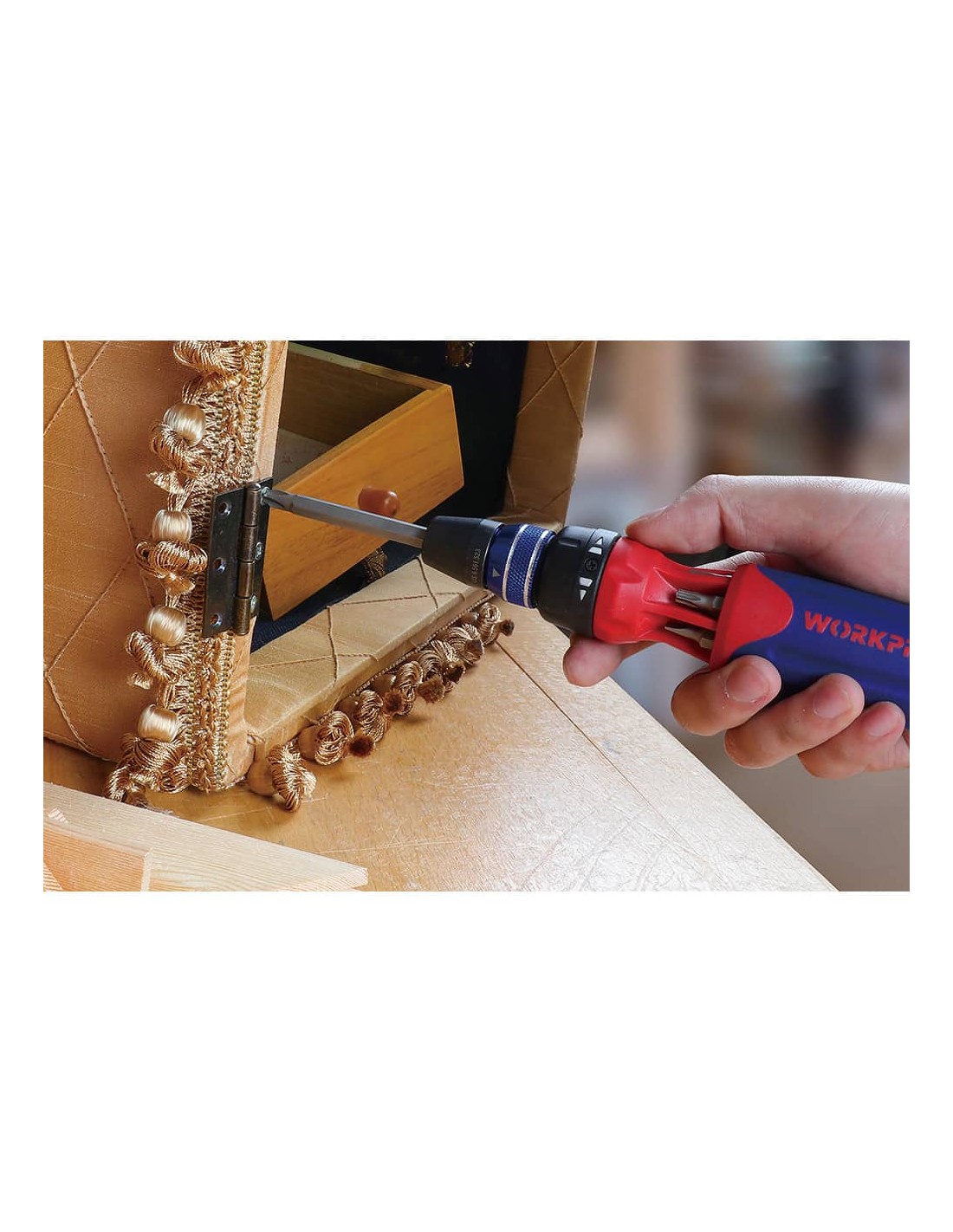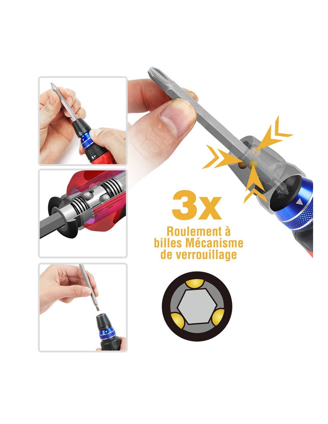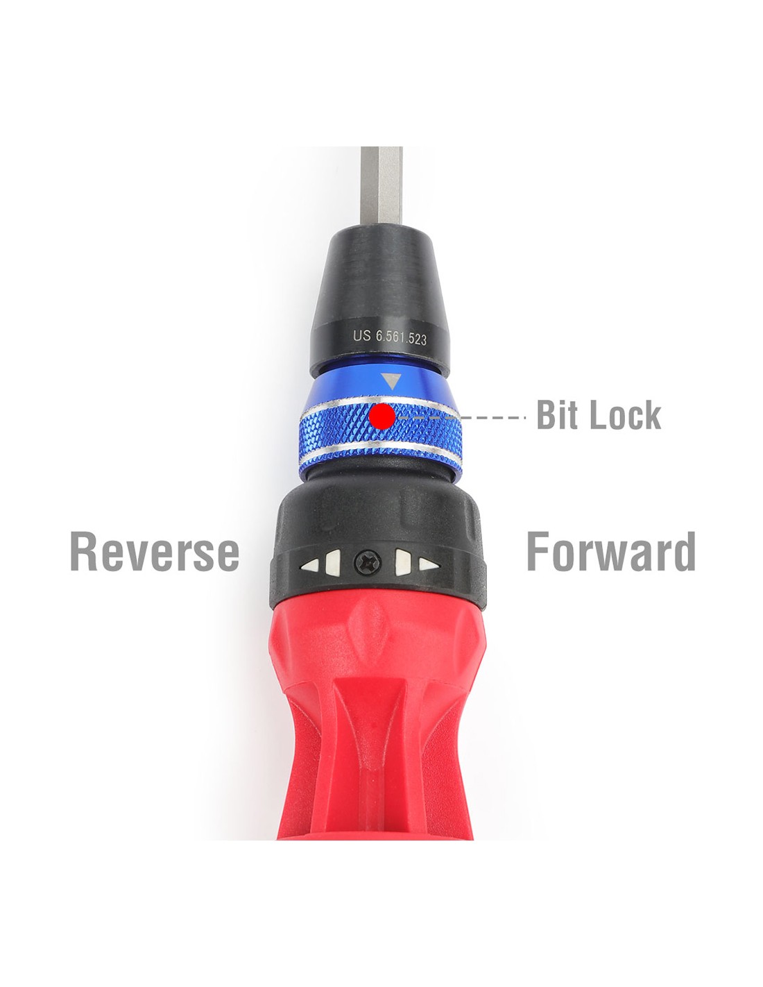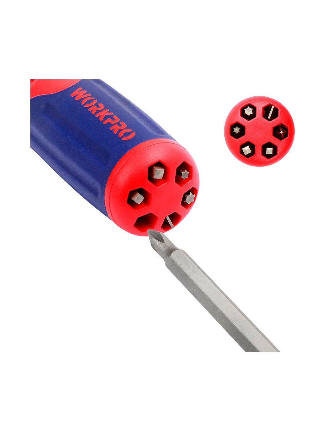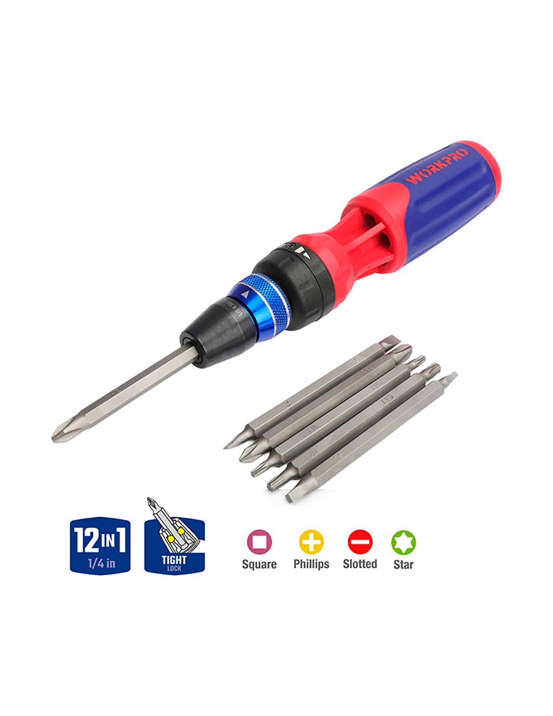 Destornillador carraca 12 en 1 diseño de cambio rápido de punta, autoapretado. 6 puntas dobles de acero almacenadas en el mango. plana 4 mm, plana 5 mm, ph1, ph2, ph3, t10, t15, t20, t25, s1, s2, s3. azul y rojo