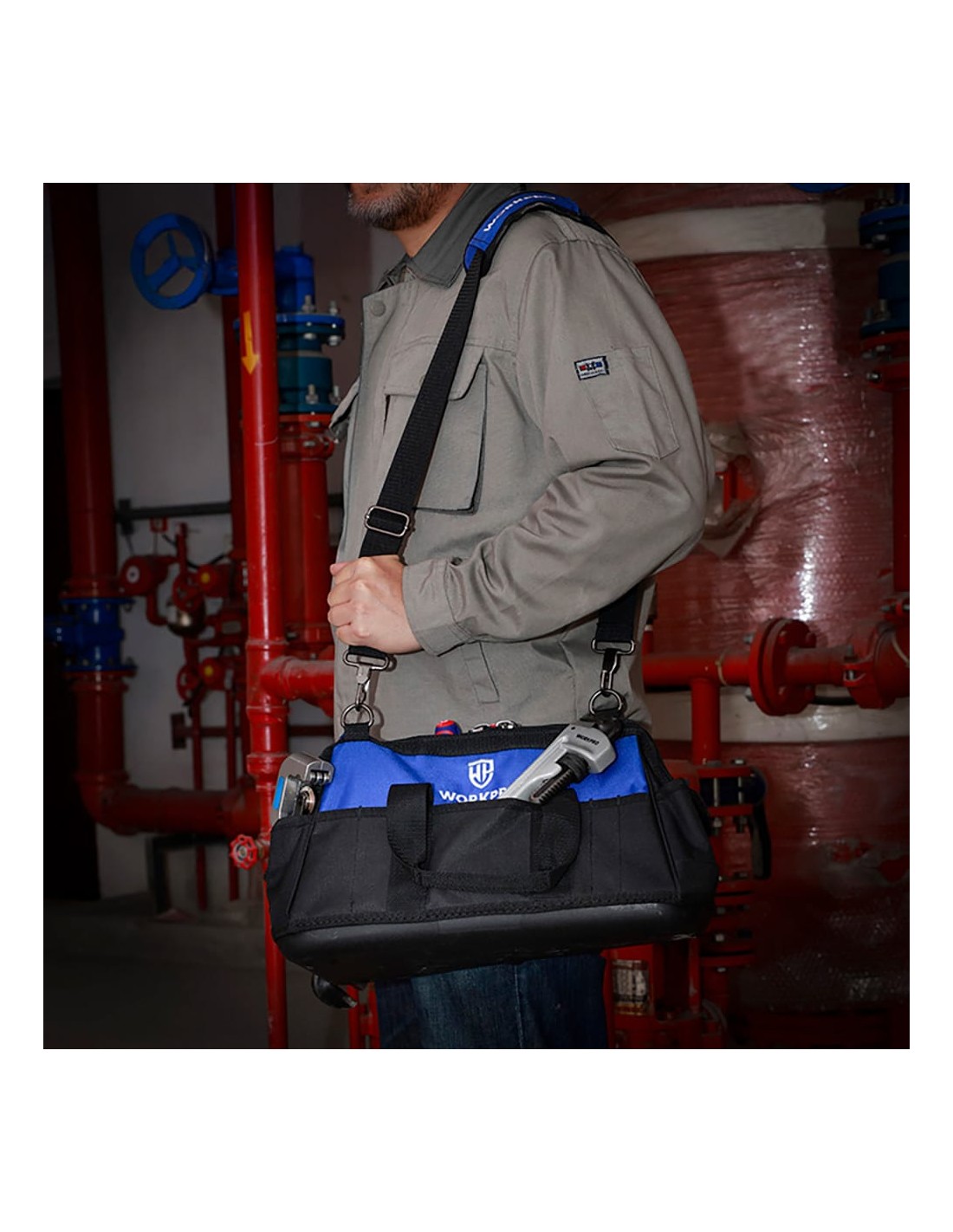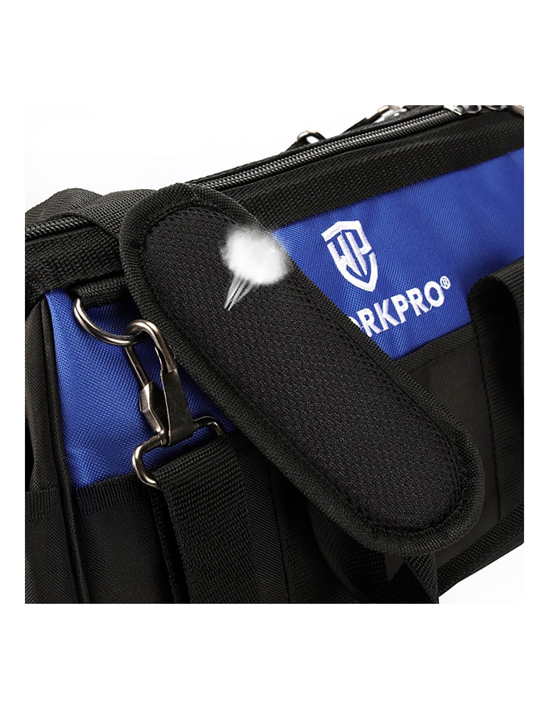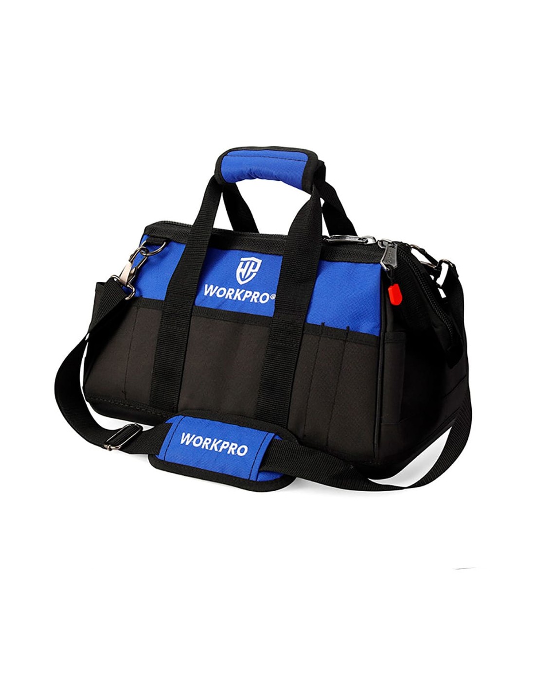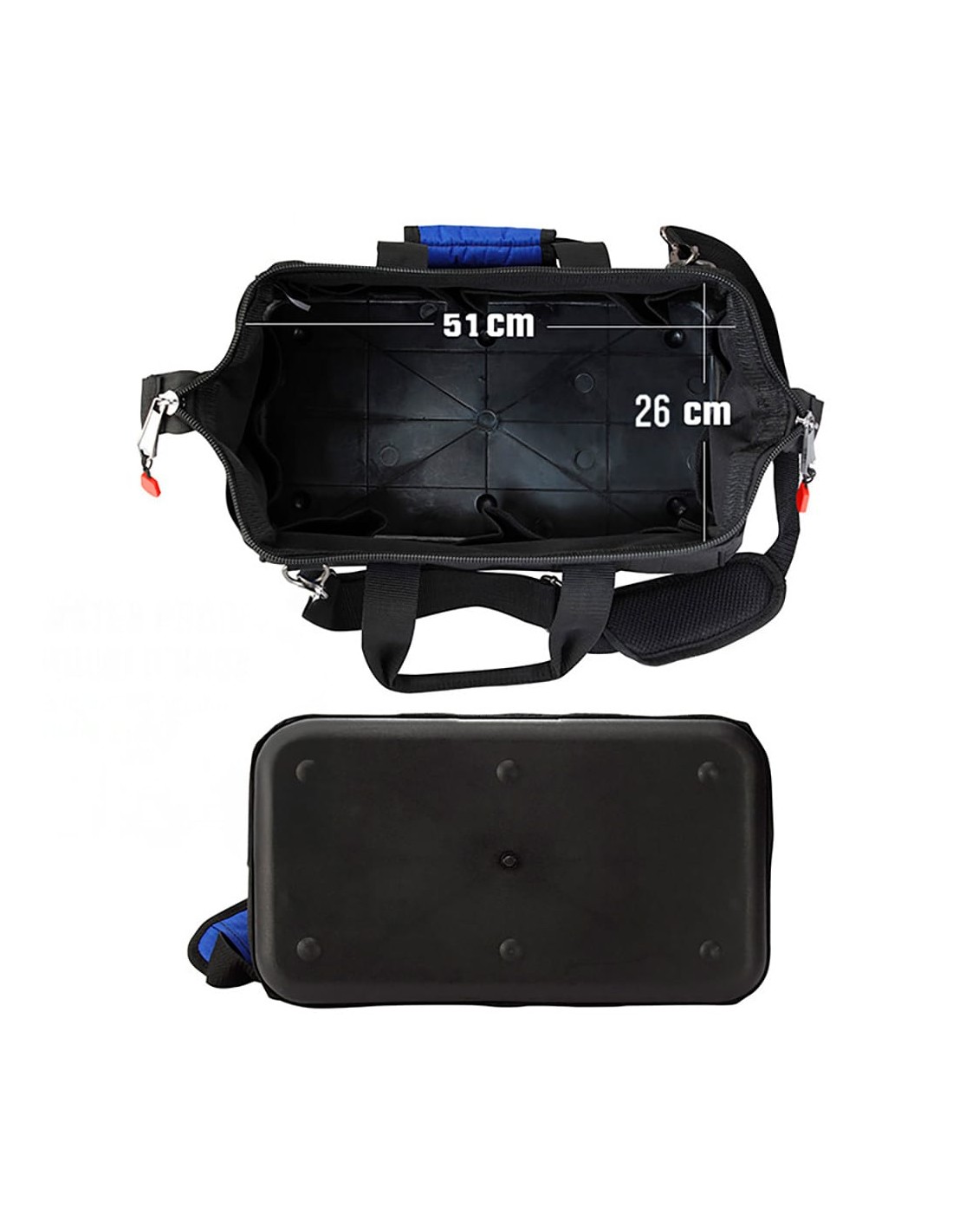 Bolsa de herramientas con cremallera en la parte superior, 51 x 26 x 29 cm. 21 bolsillos. base a prueba de agua. bolsa de almacenamiento de boca ancha que permite un fácil acceso al contenido. correa ajustable, bolsillos exteriores para guardar objetos personales, herramientas pequeñas y accesorios. negra y azul