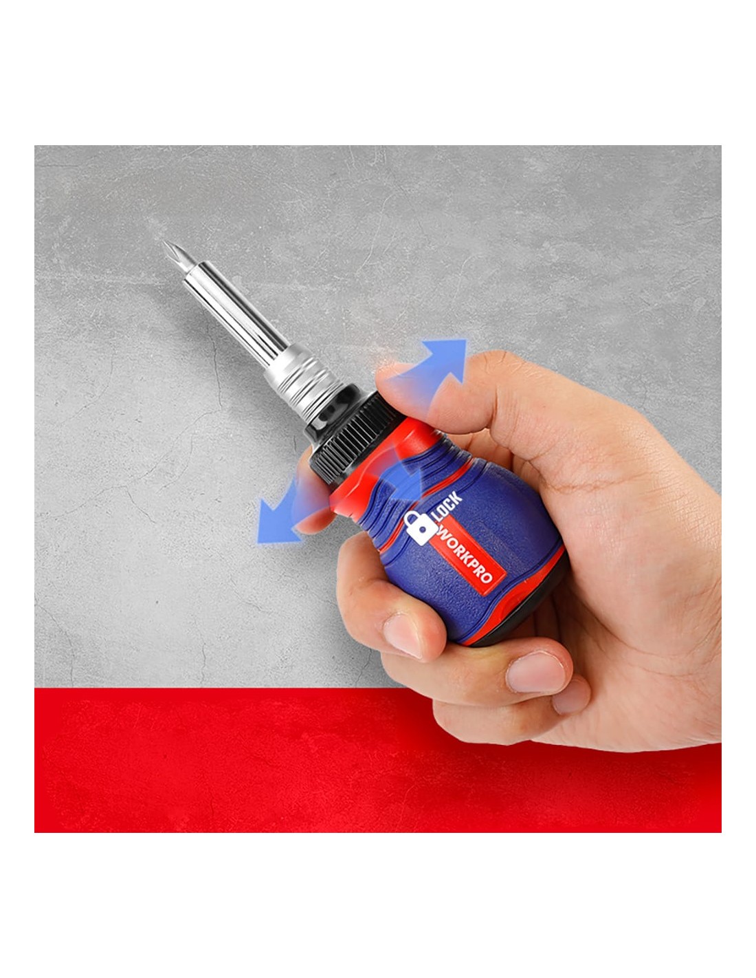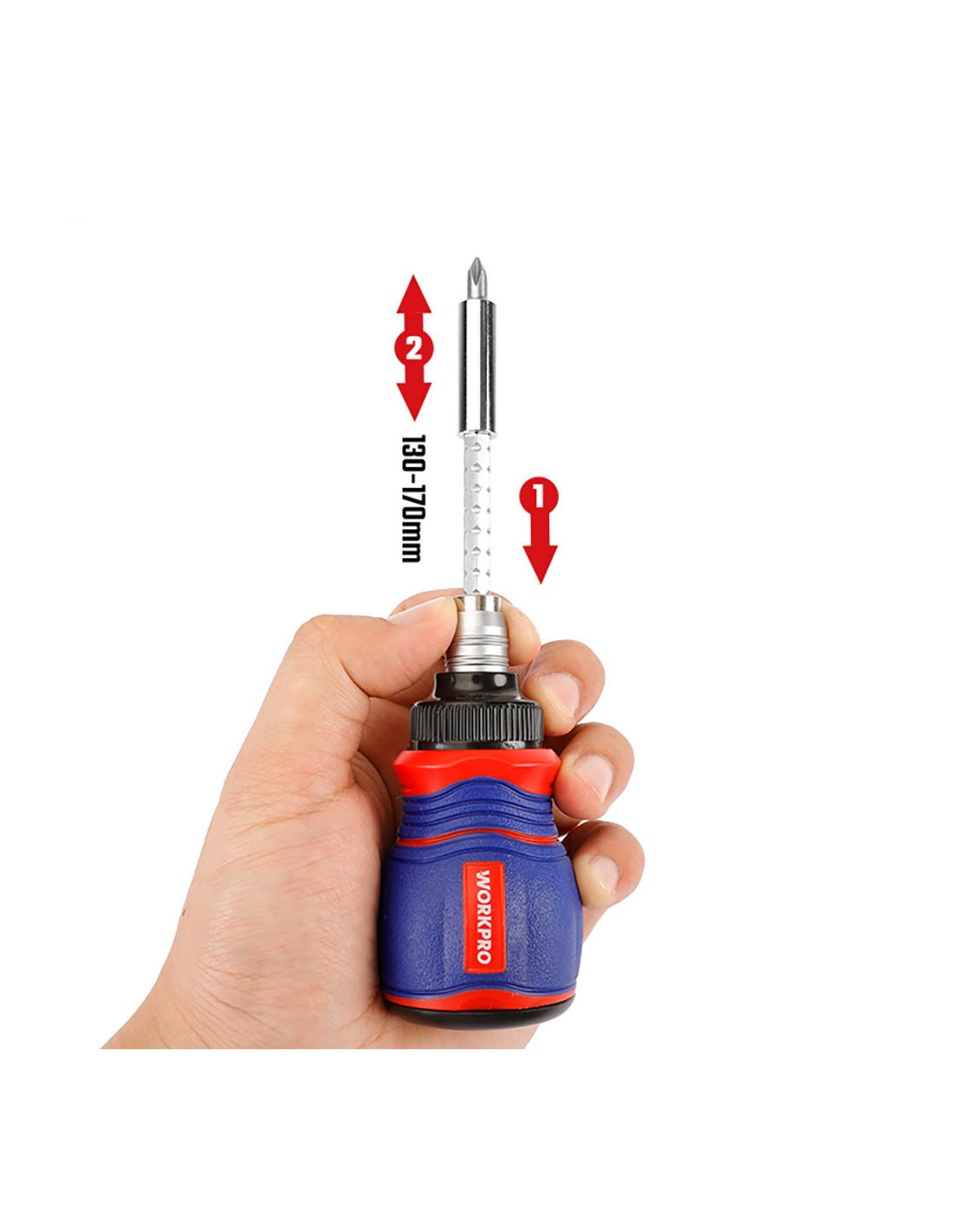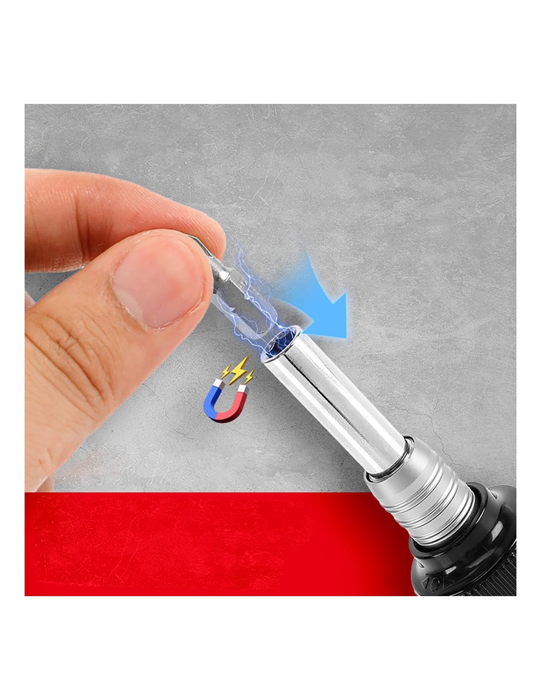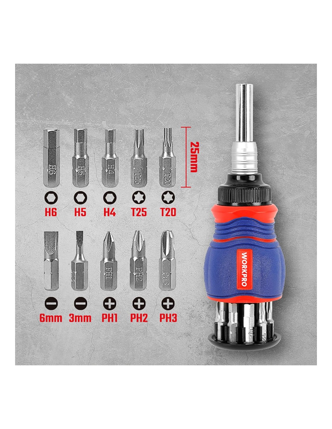 Juego compuesto por un mango con alojamiento para 10 puntas magnéticas de cromo vanadio 35 x 25 mm: sl3, sl6, ph1, ph2, ph3, h4, h5, h6, t20, t25 y una barra de extensión de 130 - 170 mm