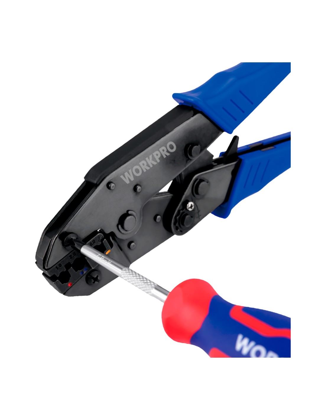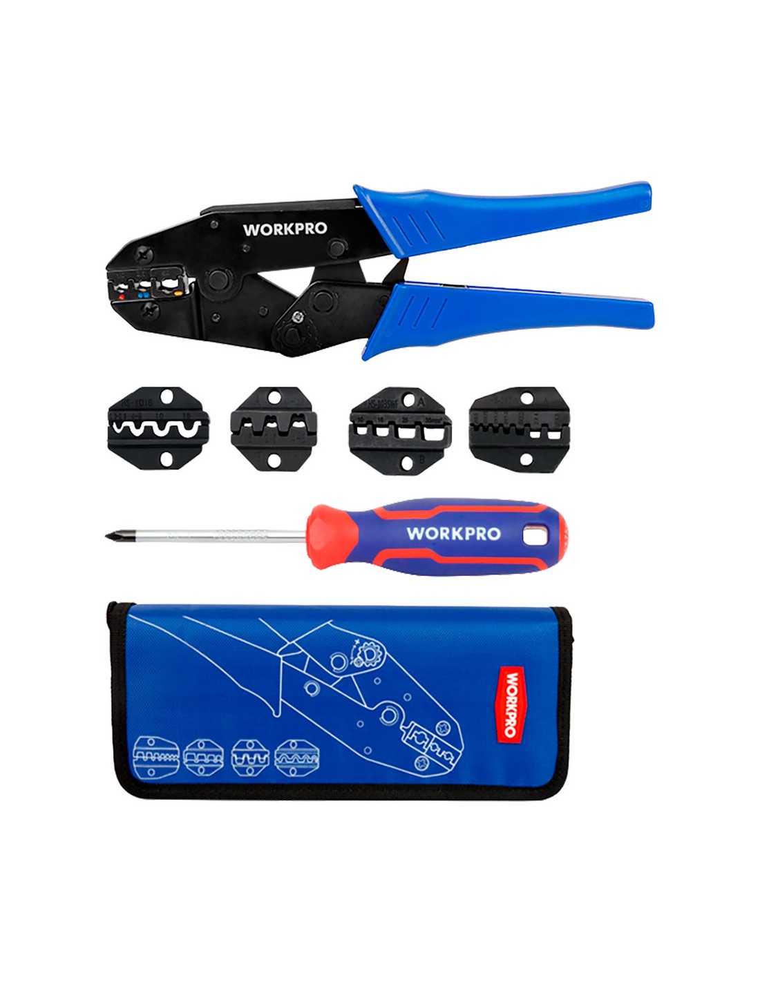 Juego de herramientas para crimpar, incluye 1 alicate de 225 mm para crimpar terminales, 5 mordazas de crimpar, 1 destornillador ph1 x 75mm y una bolsa de almacenamiento acero de mn, para crimpar la mayoría de terminales y conectores de cable no aislados y aislados mordazas intercambiables: 1,0-2,5-6,0 mm², s1016 (0.3-2.5, 4-6, 10,16), s03b (0.5-1, 1-2, 5, 4-6), s26tw (2 x 0.5, 2 x 0.75, 2 x 1.0, 2 x 1.5, 2 x 2.5, 2 x 4, 2 x 6), s35wf (10,16, 25, 35 mm²), rango total de crimpar 0.5 - 35 mm² (20-2 awg) diseño de mecanismo de trinquete autoajustable