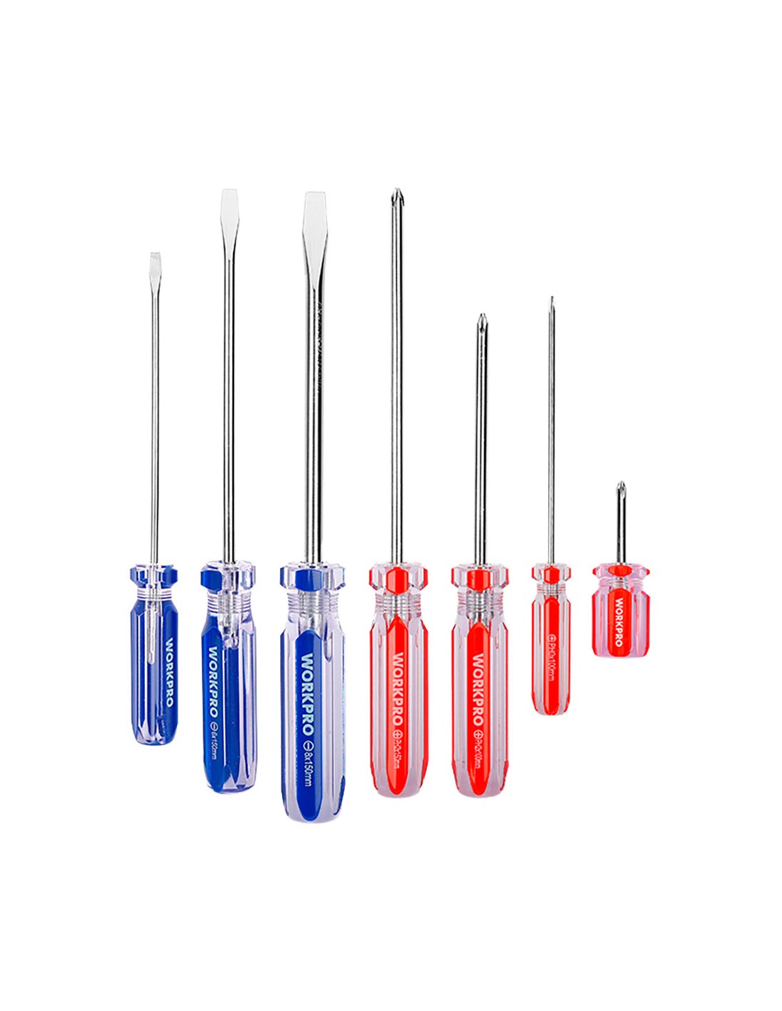 Destornilladores con mango de cristal, juego 7 piezas acero cromo-vanadio punta magnética mango transparente de pvc incluye: 3 planos: sl3 x 100 mm, sl6 x 150 mm, sl8 x 150 mm 4 phillips: ph0 x 100 mm, ph2 x 100 mm, ph2 x 150 mm, ph2 x 38 mm
