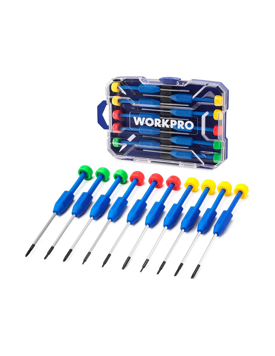 Destornilladores cr-v de precisión, juego 10 piezas hoja de acero cromo vanadio, punta negra con imán contiene: 4 planos: 1,5mm, 2 mm, 2,5 mm, 3 mm 3 phillips: ph000, ph00, ph0 3 torx: t7, t8, t9 1 estuche de almacenamiento transparente