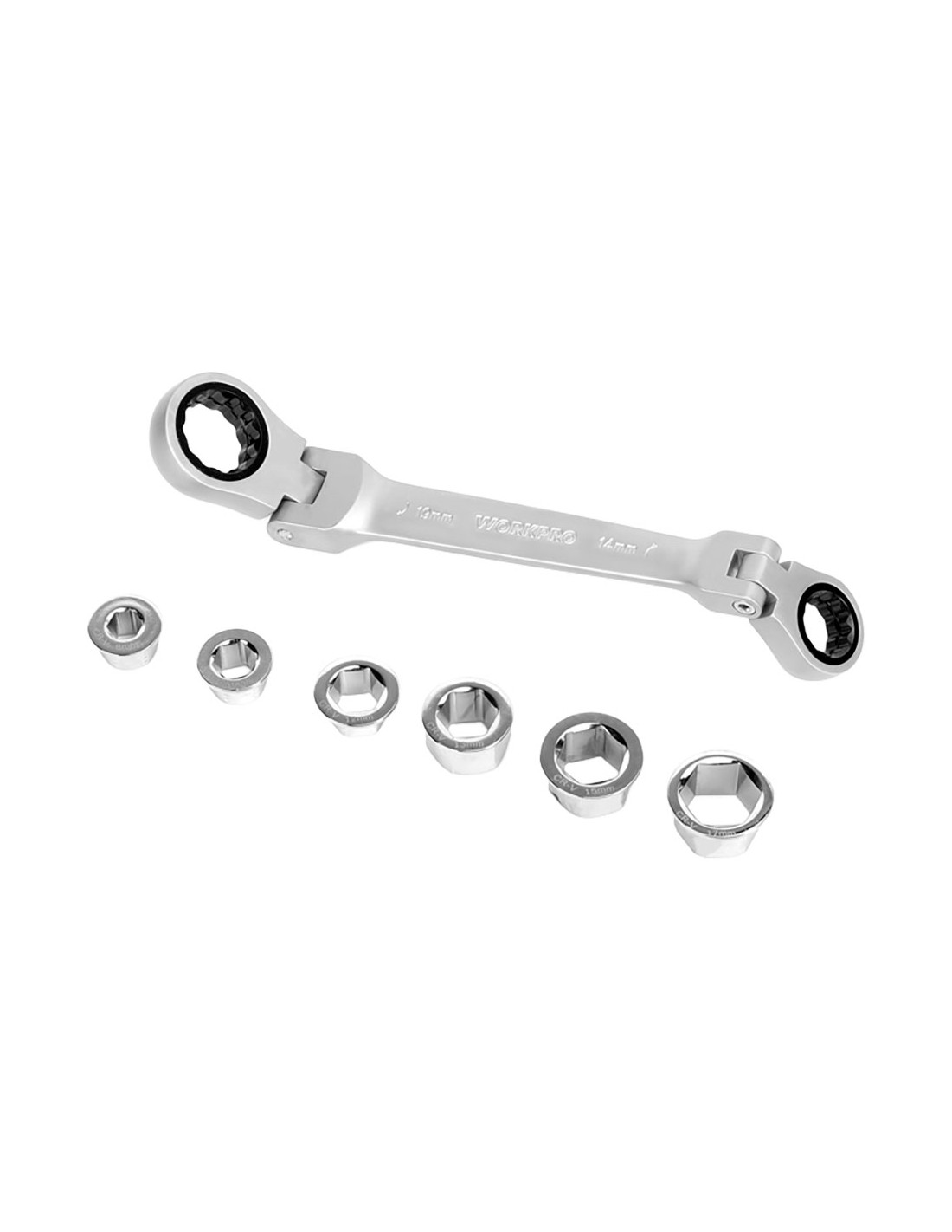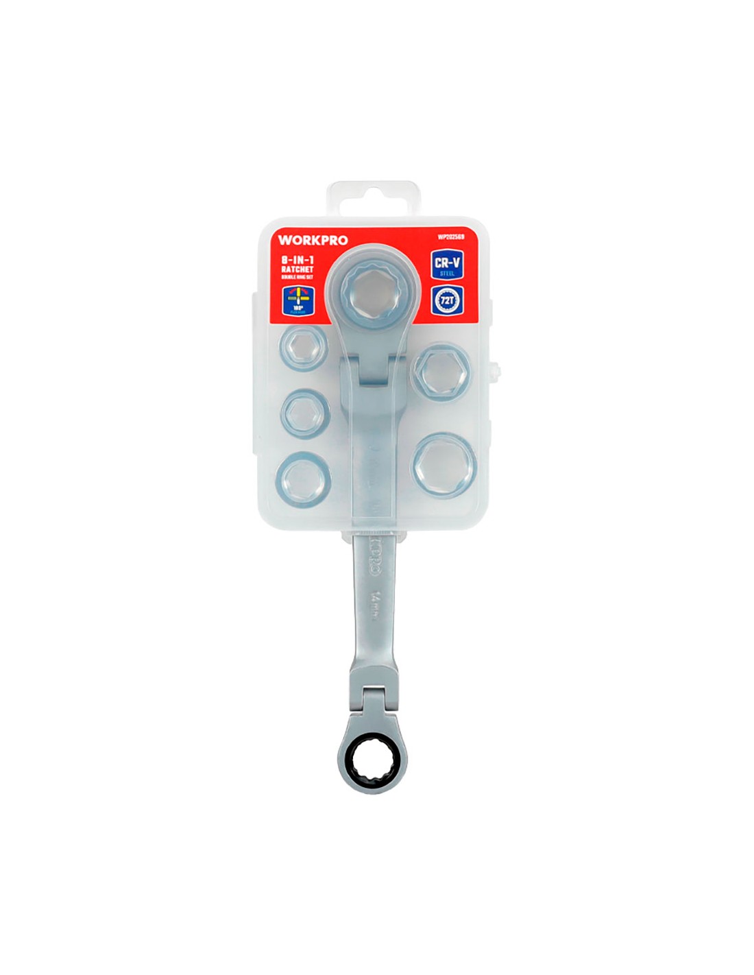 Llave de estrella cr-v doble con carraca articulada. 8 en 1, 72t, 14 x 19 mm, cabezal flexible 180°, con bocas intercambiables: 8, 10, 12, 13, 15 y 17 mm