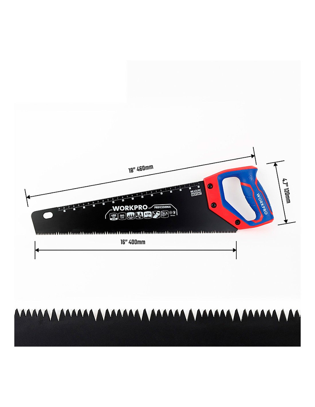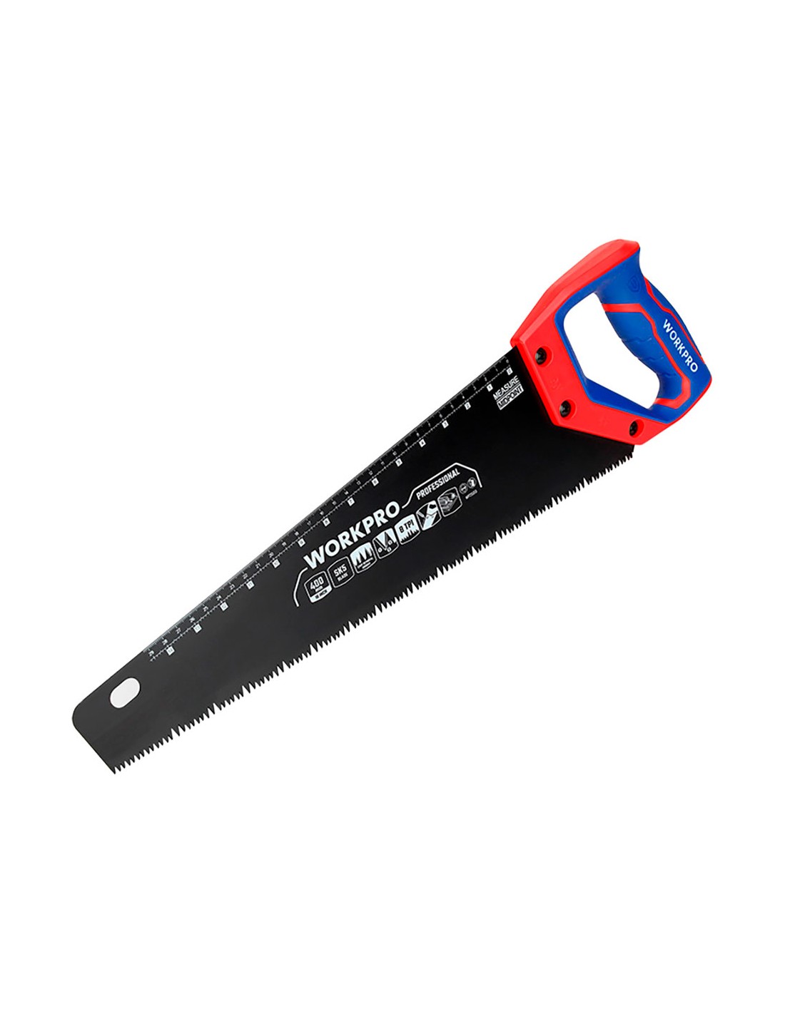 Serrucho universal sk5 teflón, 8 tpi, 400 mm mango ergonómico con bordes diseñados para ayudarte a trazar ángulos comunes sin necesidad de otra herramienta (90° y 45°), con marca de escala, hoja de sierra sk5 duradera dientes de triple afilado diseño de dientes grandes y pequeños para una remoción de virutas más rápida y mayor eficiencia tratamiento superficial de teflón para un uso más suave para el corte rápido de madera, bambú, pvc y otros materiales